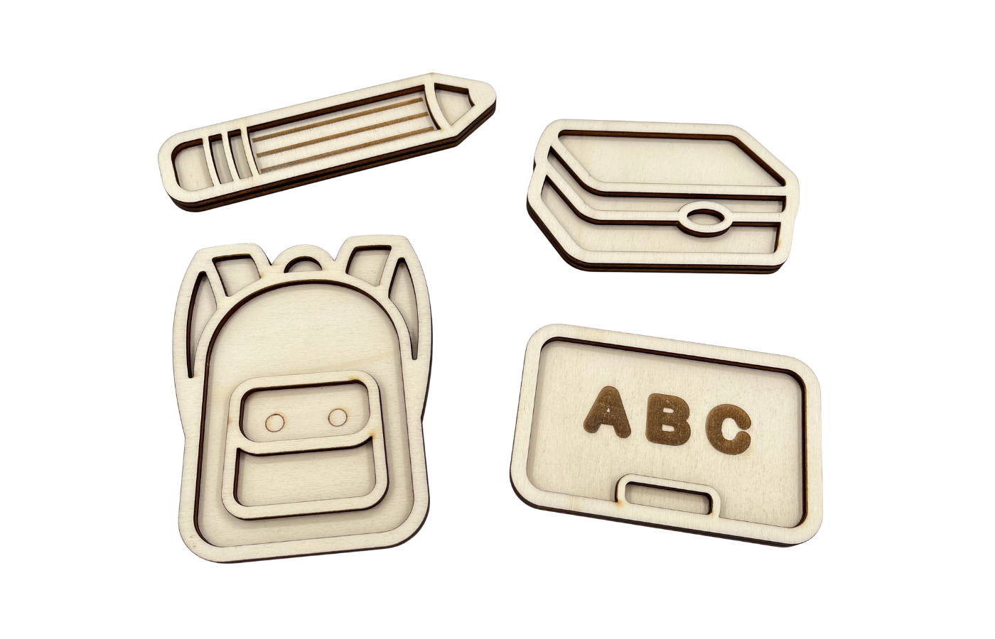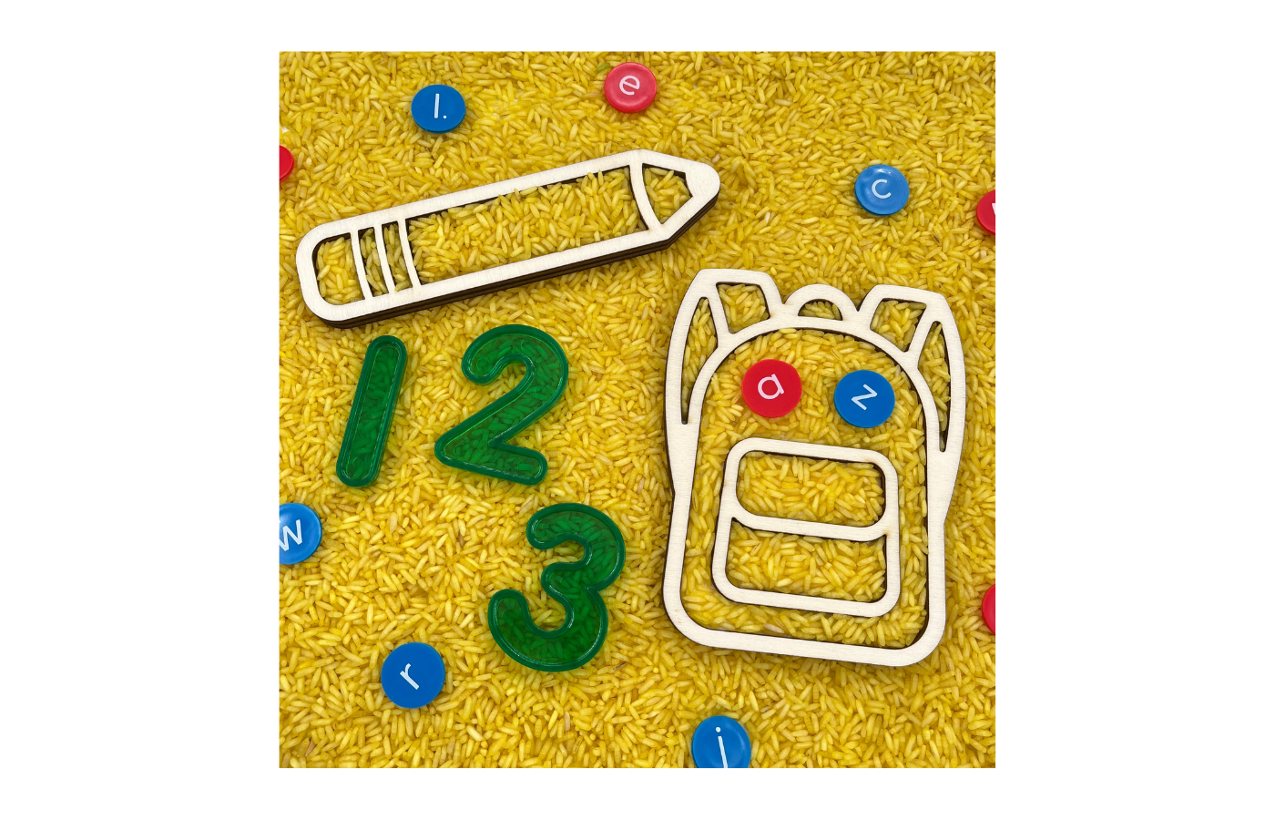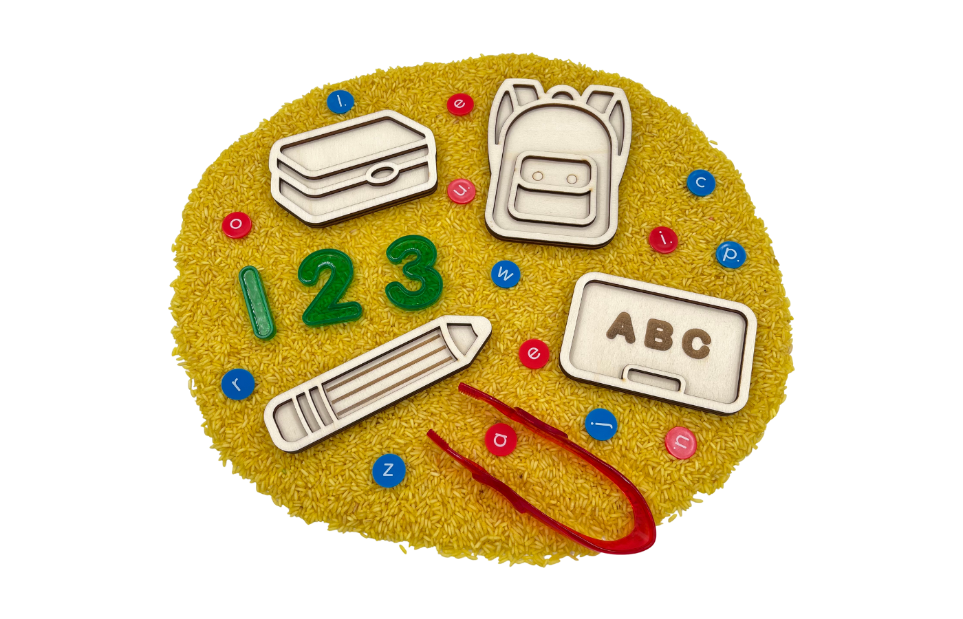 Plateaux de jeu sur le thème de la rentrée (crayon, sac à dos, tableau d'activités et boîte à lunch). Parfaits pour y mettre des matériaux secs comme du riz, des pois chiches, du sable fin et bien plus encore. Dans un format mignon.