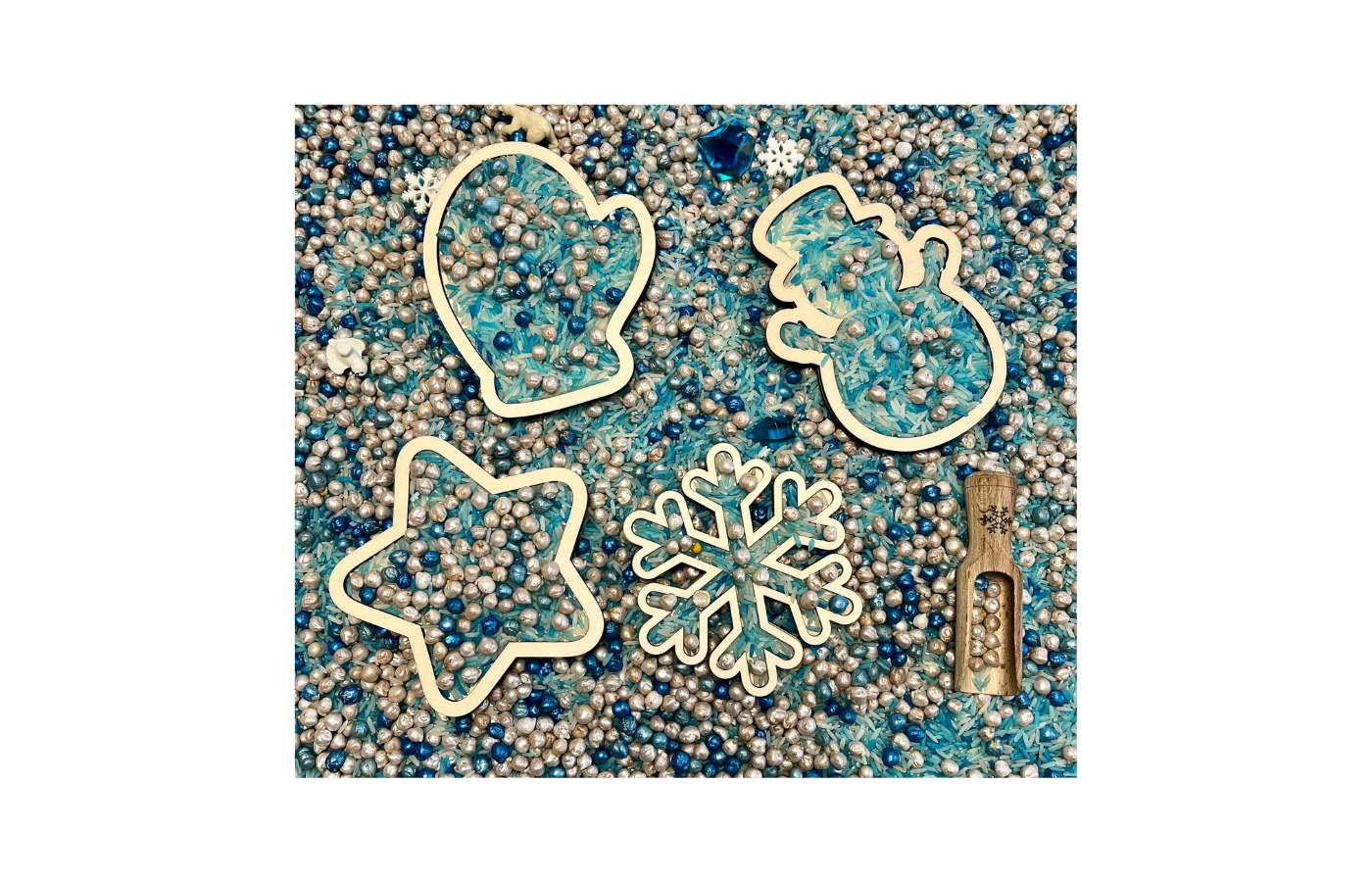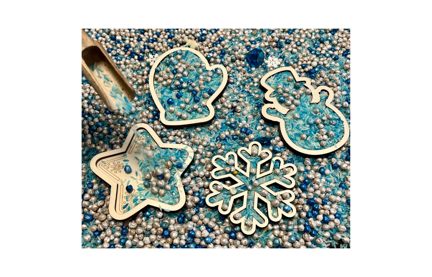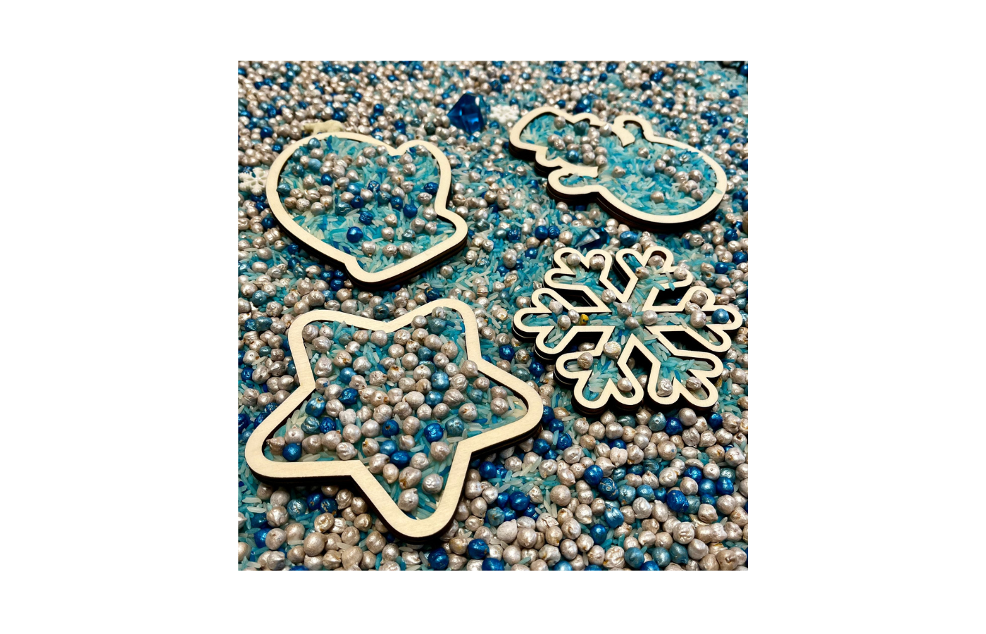 Formes de jeu ou plateaux de jeu sur le thème de l'hiver. Quatre figures différentes sur le thème de l'hiver (bonhomme de neige, flocon de neige, étoile et gant). Parfait à remplir avec des matériaux secs tels que du riz à jouer, des pois chiches, du sable fin,... dans un format amusant.