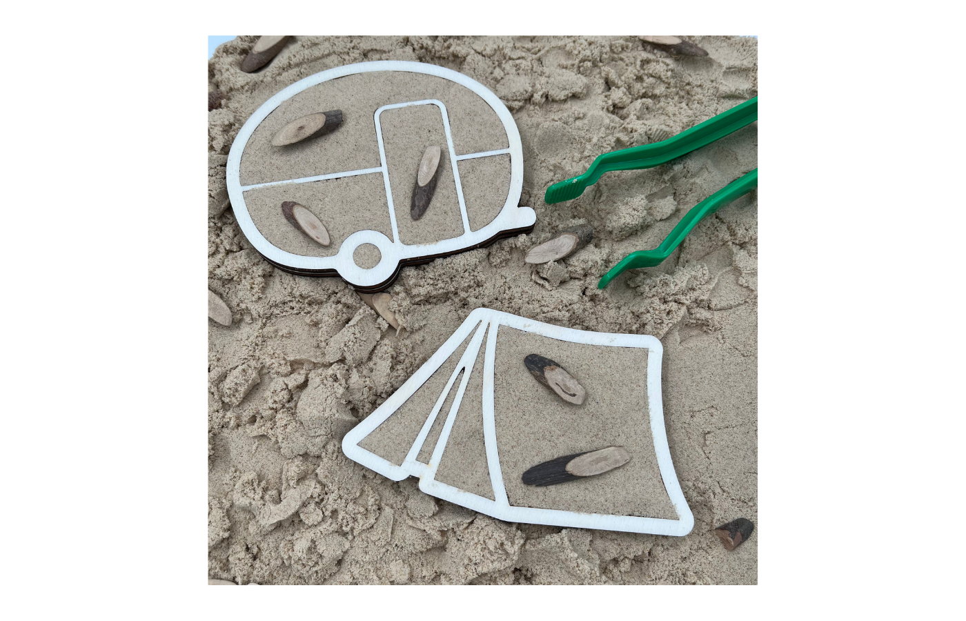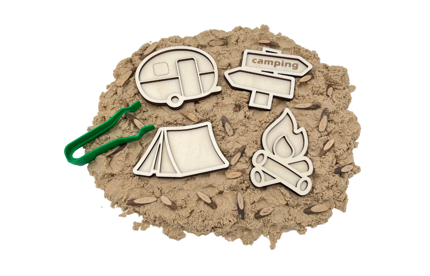 Plateaux de jeu sur le thème du camping d'été. Quatre figurines différentes (feu de camp, caravane, indicateur et tente) dans un format amusant. Parfaits pour être remplis de matériaux secs comme du riz, des pois chiches, du sable fin, etc.