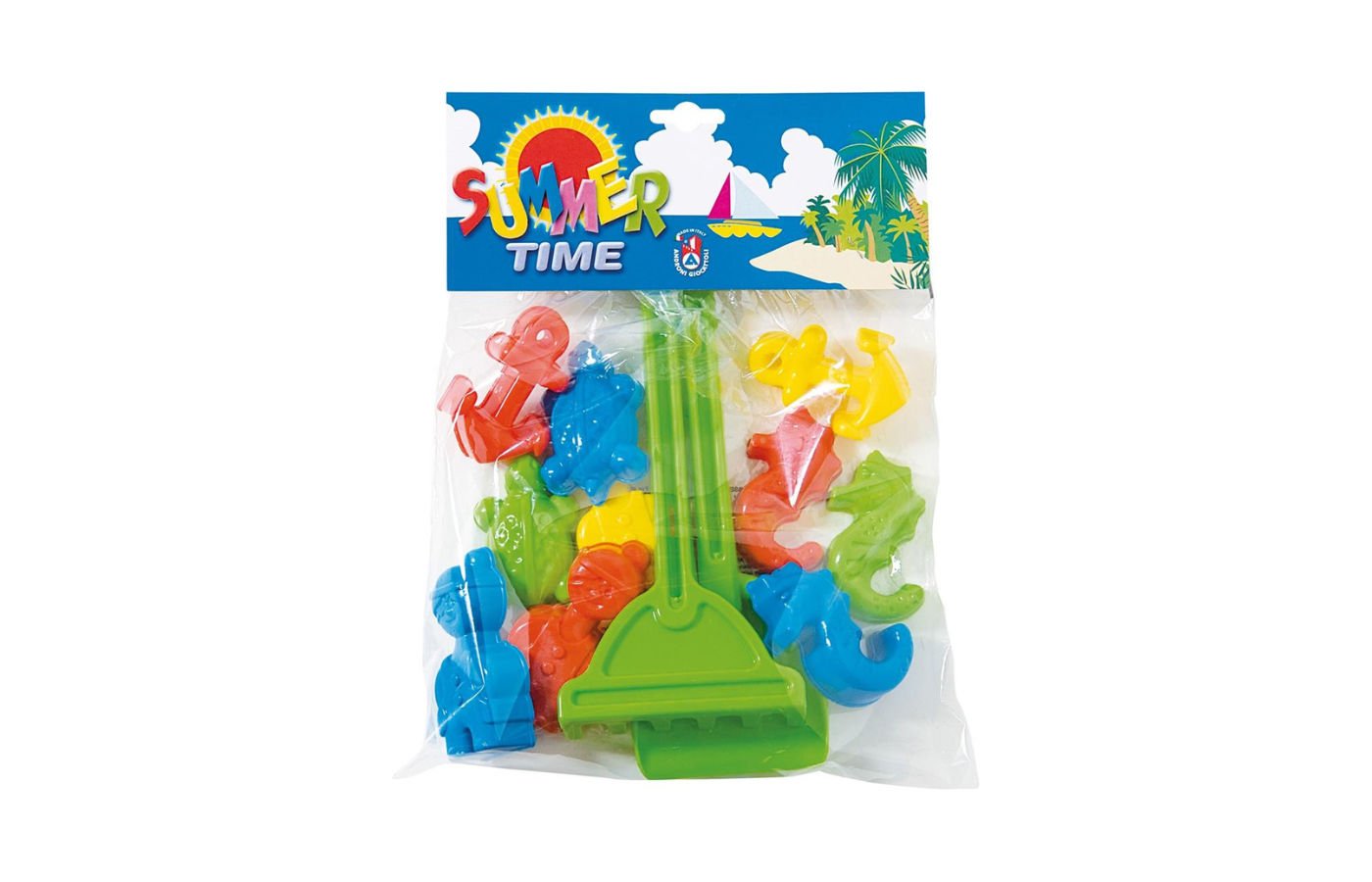 Ce set de plage en jouet est réalisé dans des couleurs vives. Le set se compose d'un petit râteau, d'une pelle et de 10 jolis moules à sable. Idéal pour le bac à sable ou à la plage.