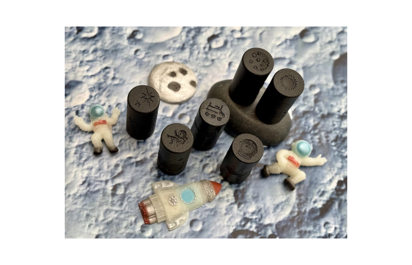 Coffret de 6 rouleaux sur le thème de l'espace (casque et astronaute, rover lunaire et paysage lunaire, lune et lancement de fusée, soleil et système solaire, sortie dans l'espace et capsule, étoiles et télescope) (7,5 x 3,5 cm)