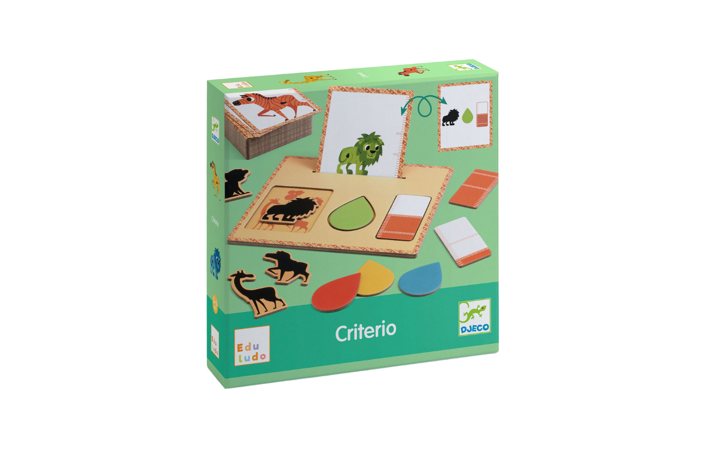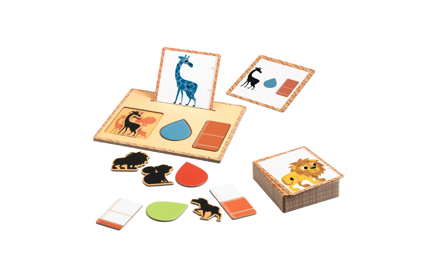 Un jeu d'assemblage de critères. À l'aide d'une carte d'animaux, l'enfant recherche les 3 caractéristiques correspondantes (forme de l'animal, couleur et taille).