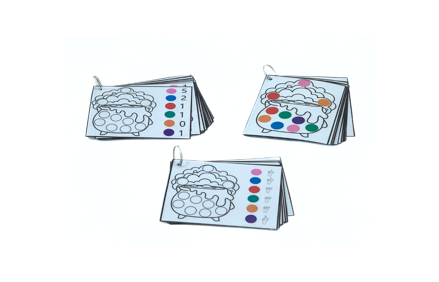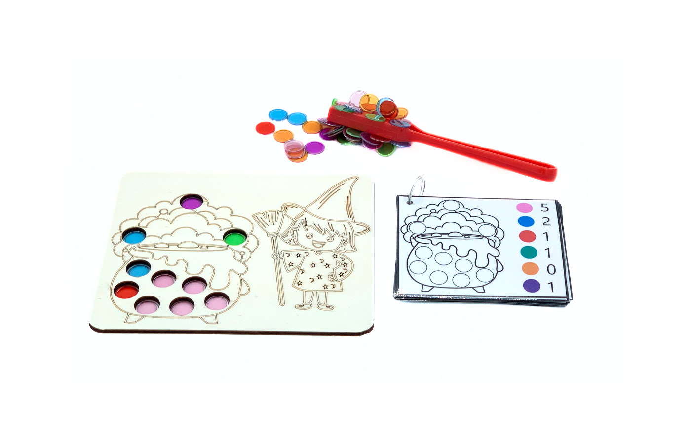 Jeu de motricité fine lié à l'orientation spatiale et aux mathématiques. Les enfants préparent avec la sorcière une délicieuse soupe de sorcière. Ce plateau de jeu peut être utilisé à la fois dans le domaine de l'orientation spatiale et des mathématiques. La différenciation est intégrée dans les 45 cartes de tâches.