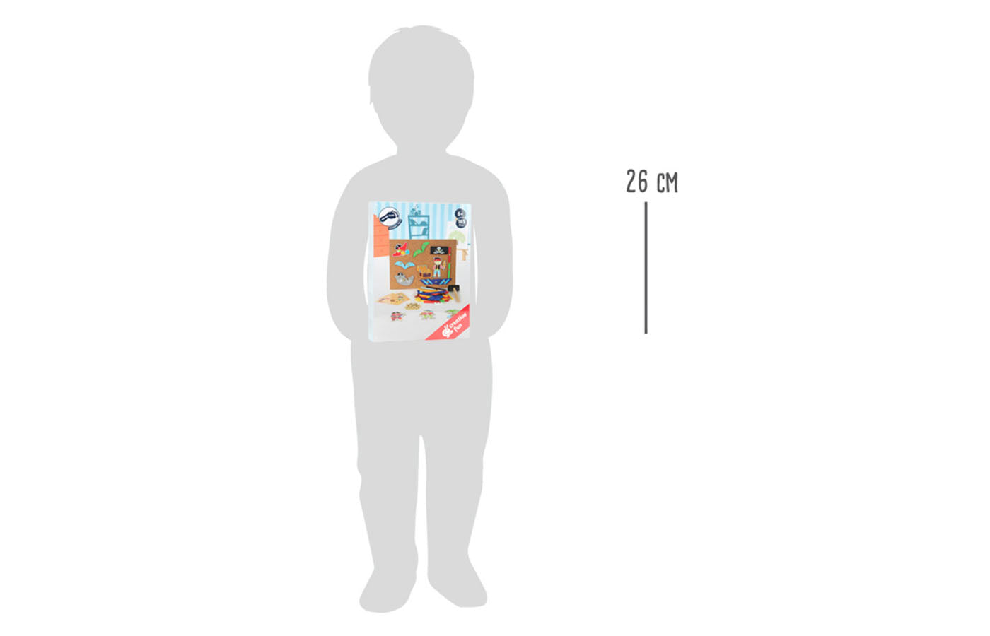 Avec ce jeu de marteau et de clous, différentes images sur le thème des pirates peuvent être enfoncées dans un tableau en liège. Il contient quatre cartes modèles à reproduire, bien sûr, les enfants peuvent également utiliser leur propre imagination et créer leur propre scène. Il est emballé dans une boîte et facile à ranger.