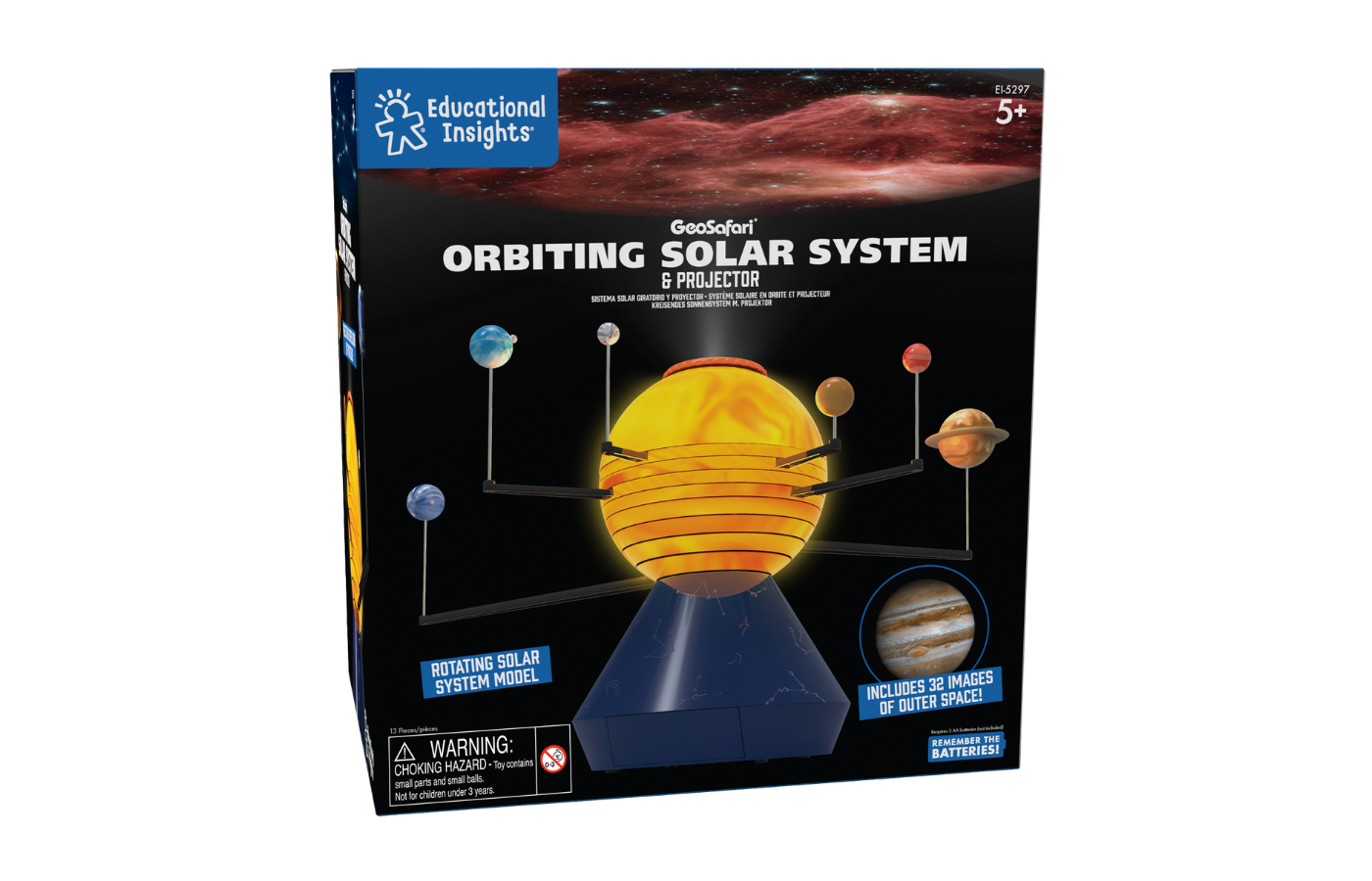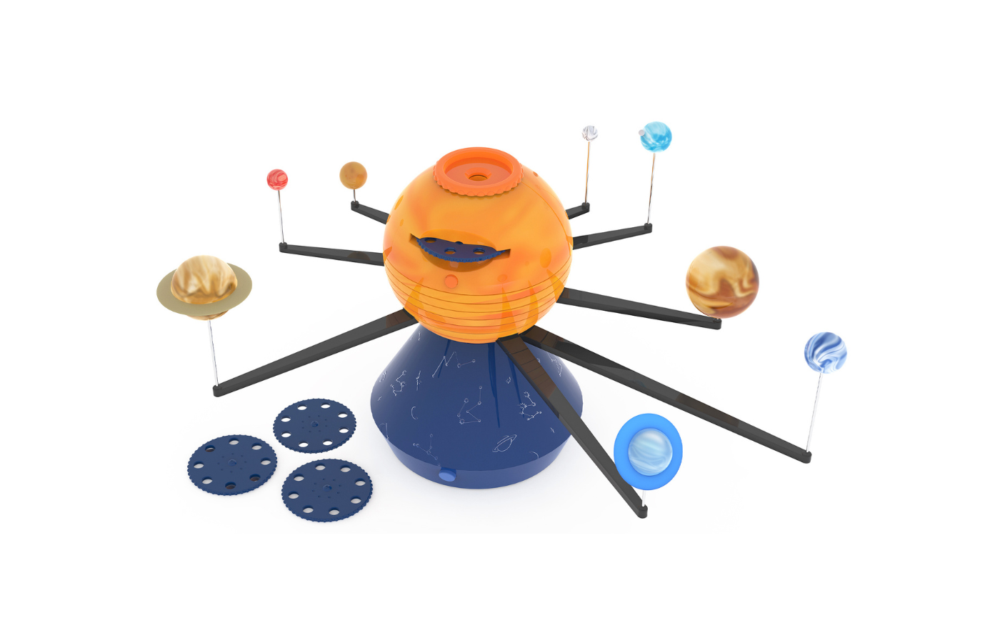 Avec ce système solaire motorisé, vous pouvez montrer aux enfants comment les planètes se comportent par rapport au soleil. Le système solaire contient le soleil et les 8 planètes. Vous pouvez placer un dôme de galaxie au-dessus du soleil, afin de voir la galaxie. Tous les composants, comme le socle et les supports des planètes, sont noirs pour qu'ils ne soient pas visibles lors d'une utilisation dans une pièce sombre.