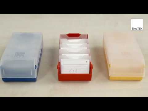 Ce classeur pour cartes au format A8 est en plastique et très solide, le couvercle semi-transparent avec fermeture à clip peut non seulement être replié mais aussi être glissé sous le classeur. Avec 5 séparateurs. Disponible en bleu et en jaune.