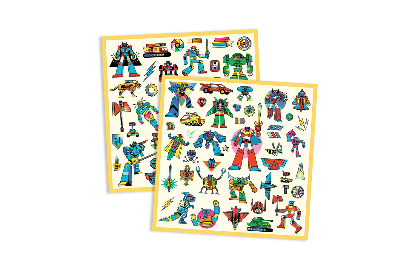 Ensemble de 4 feuilles avec chacune 40 autocollants métalliques sur le thème des robots. Embellissez votre dessin, votre projet avec ces autocollants faciles à utiliser. Les autocollants sont les décorations les plus simples au monde à un prix abordable.