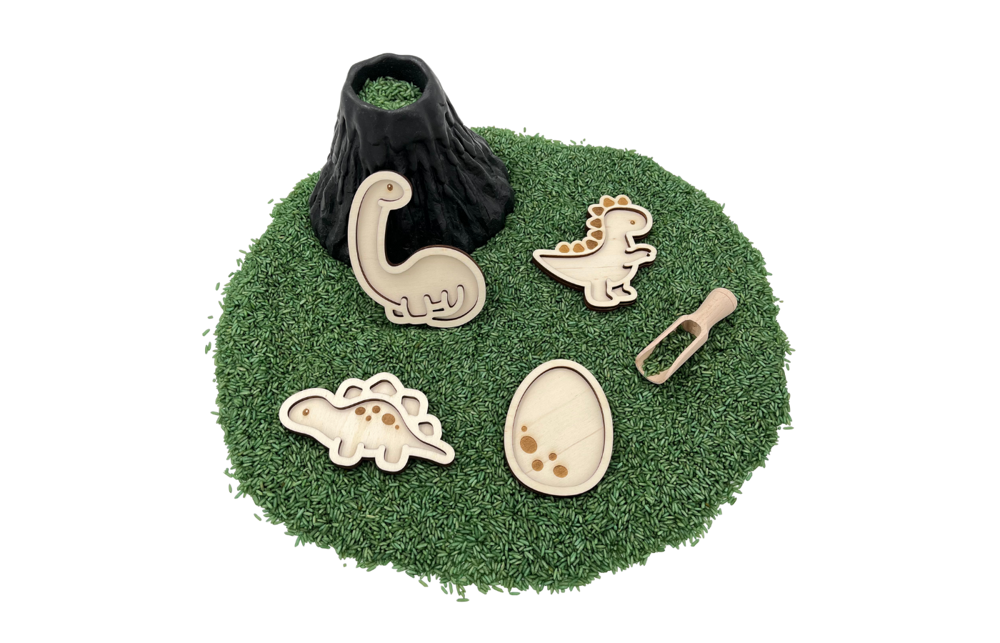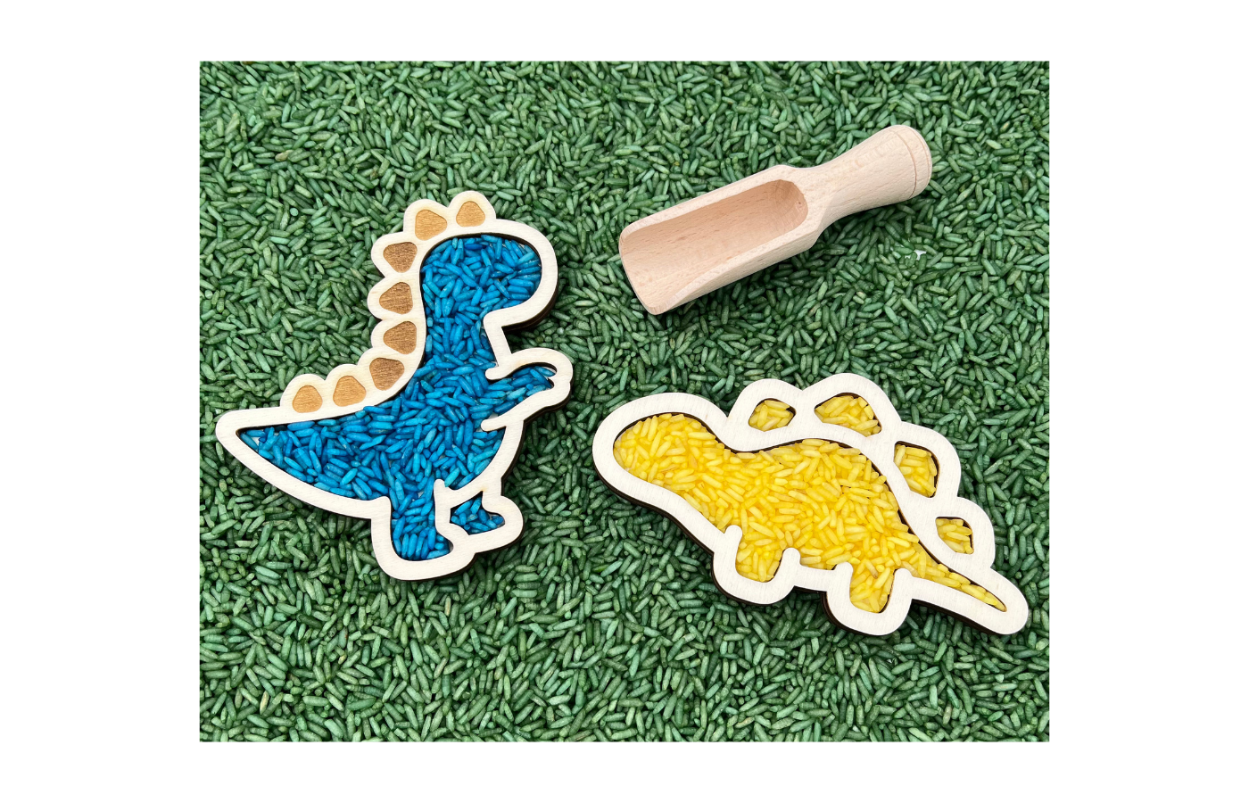 Plateaux de jeu sur le thème des dinosaures. Quatre figurines différentes (trois dinosaures et un œuf) de taille ludique. Parfaits pour être remplis de matériaux secs comme du riz, des pois chiches, du sable fin, etc.