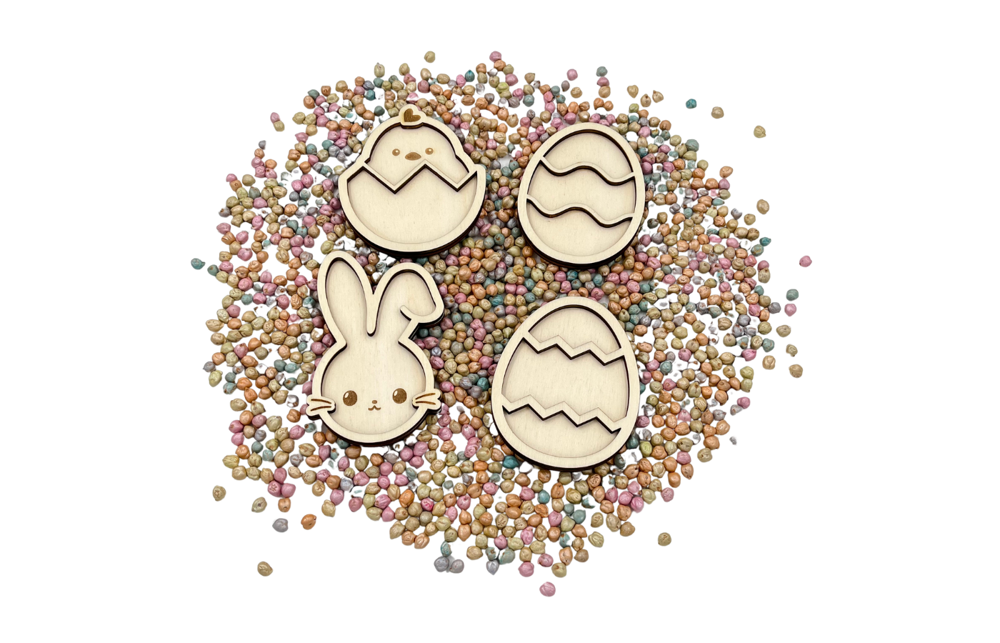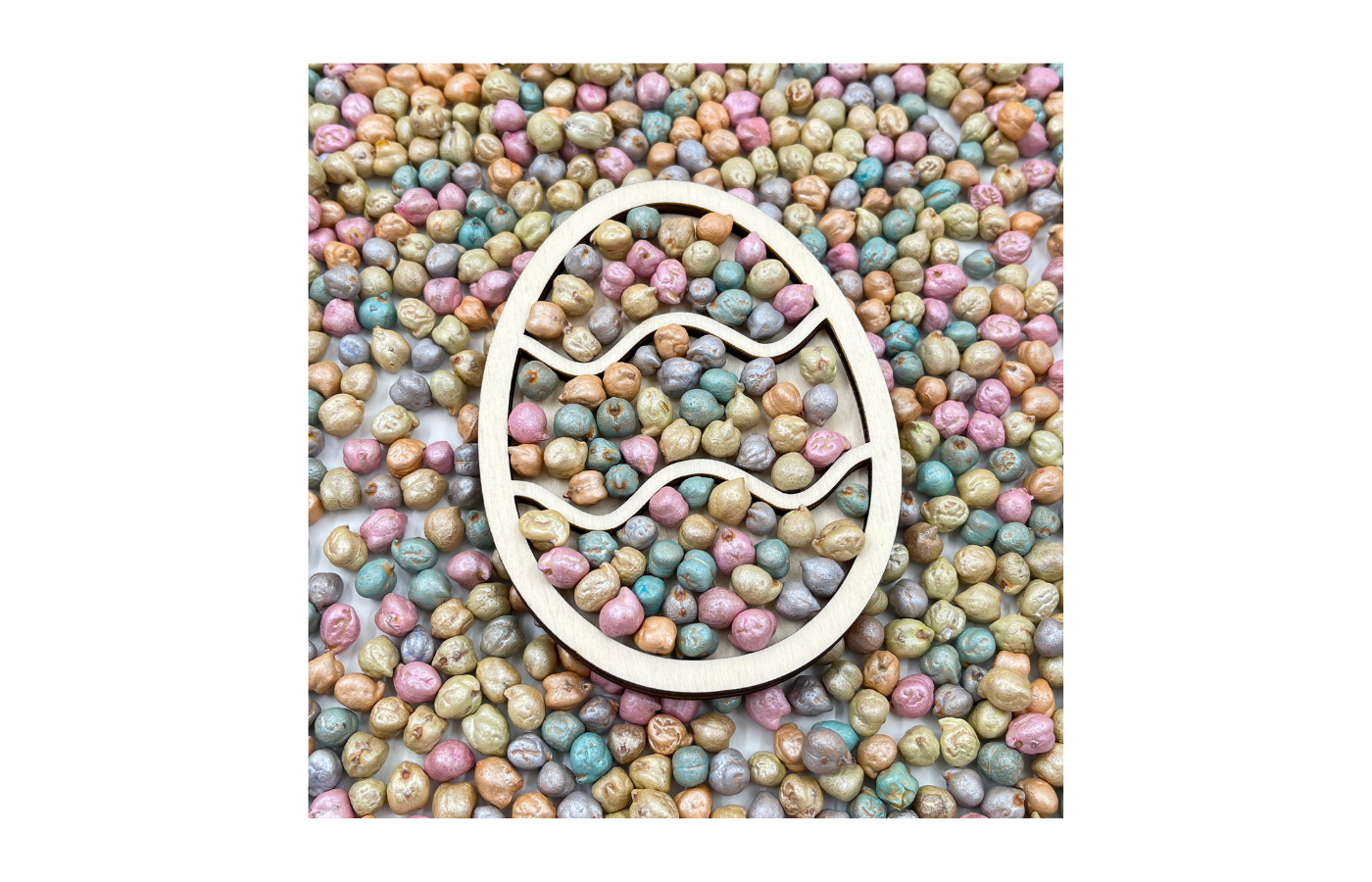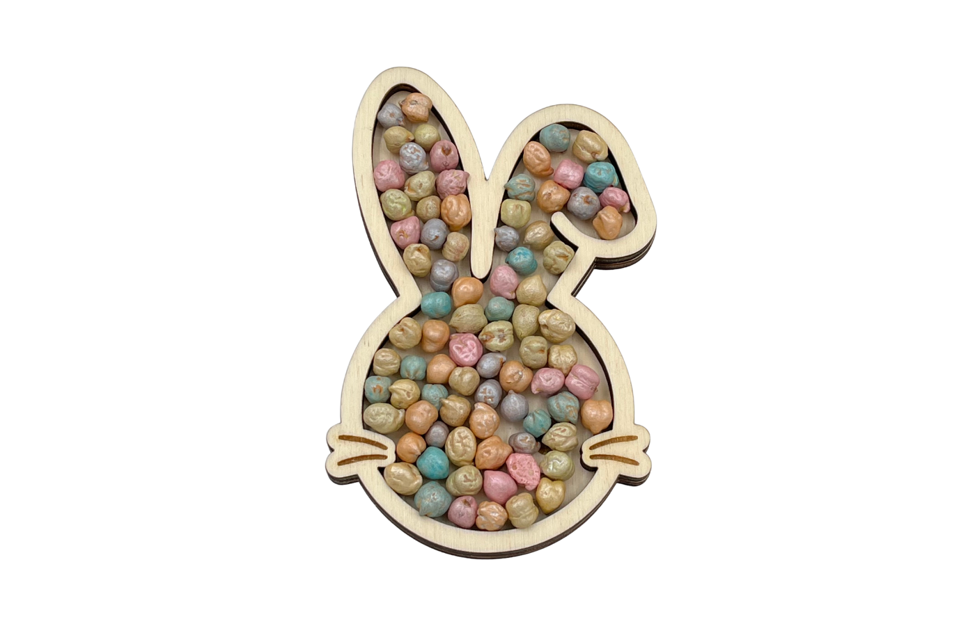 Formes de vul et plateaux de jeu sur le thème de Pâques (deux œufs, un lapin de Pâques et un poussin sortant d'un œuf). Parfait à remplir avec des matériaux secs tels que du riz à jouer, des pois chiches, du sable fin,... Dans un format mignon.