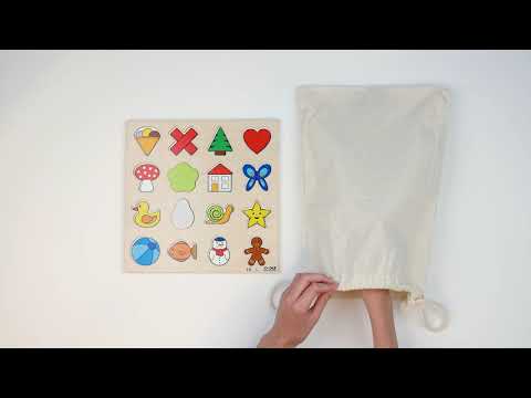 Un jeu de toucher original où vous cherchez visuellement l'objet qui correspond à la forme que vous touchez avec vos mains. Mettez toutes les formes en bois dans le sac en coton et placez le plateau de jeu devant vous sur la table.