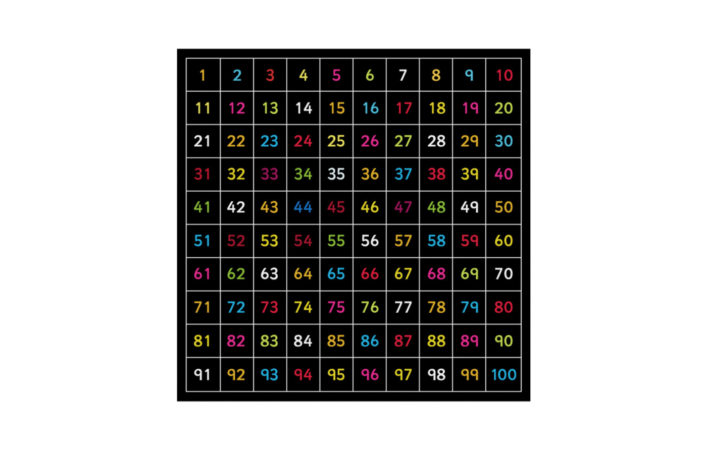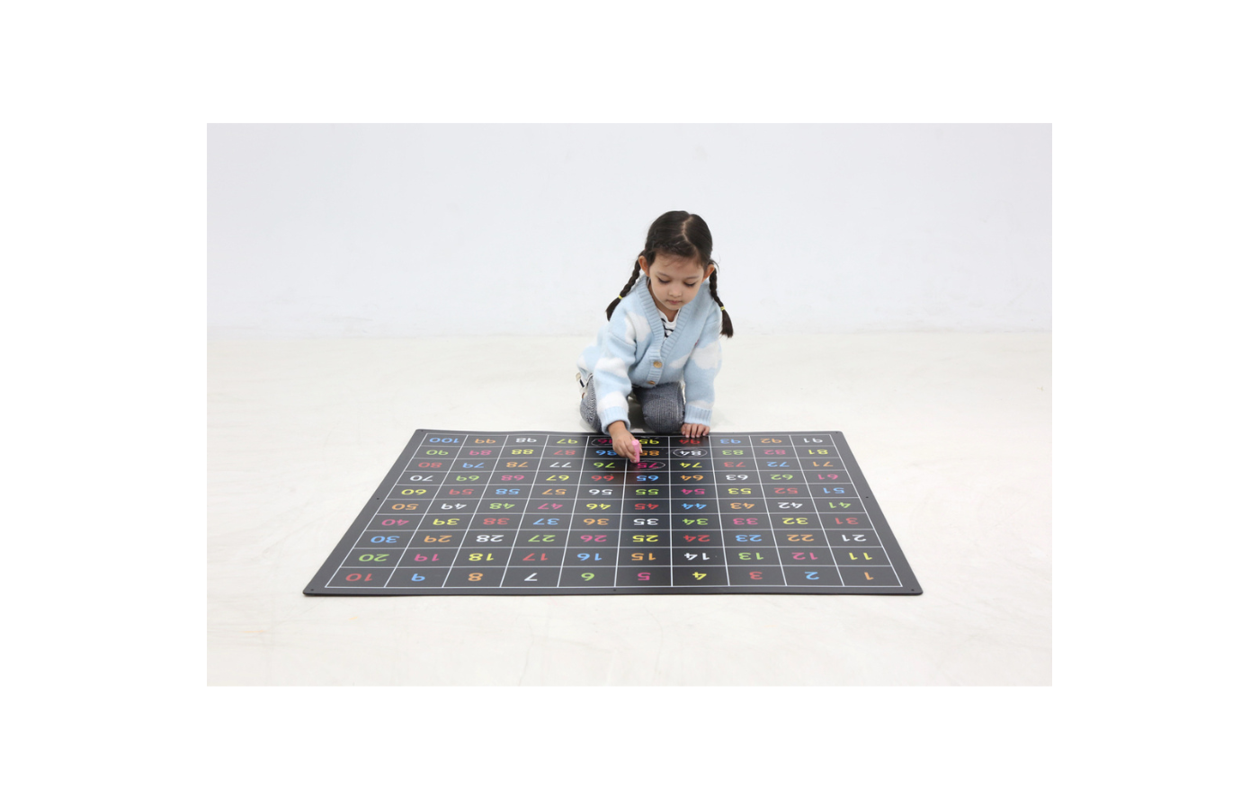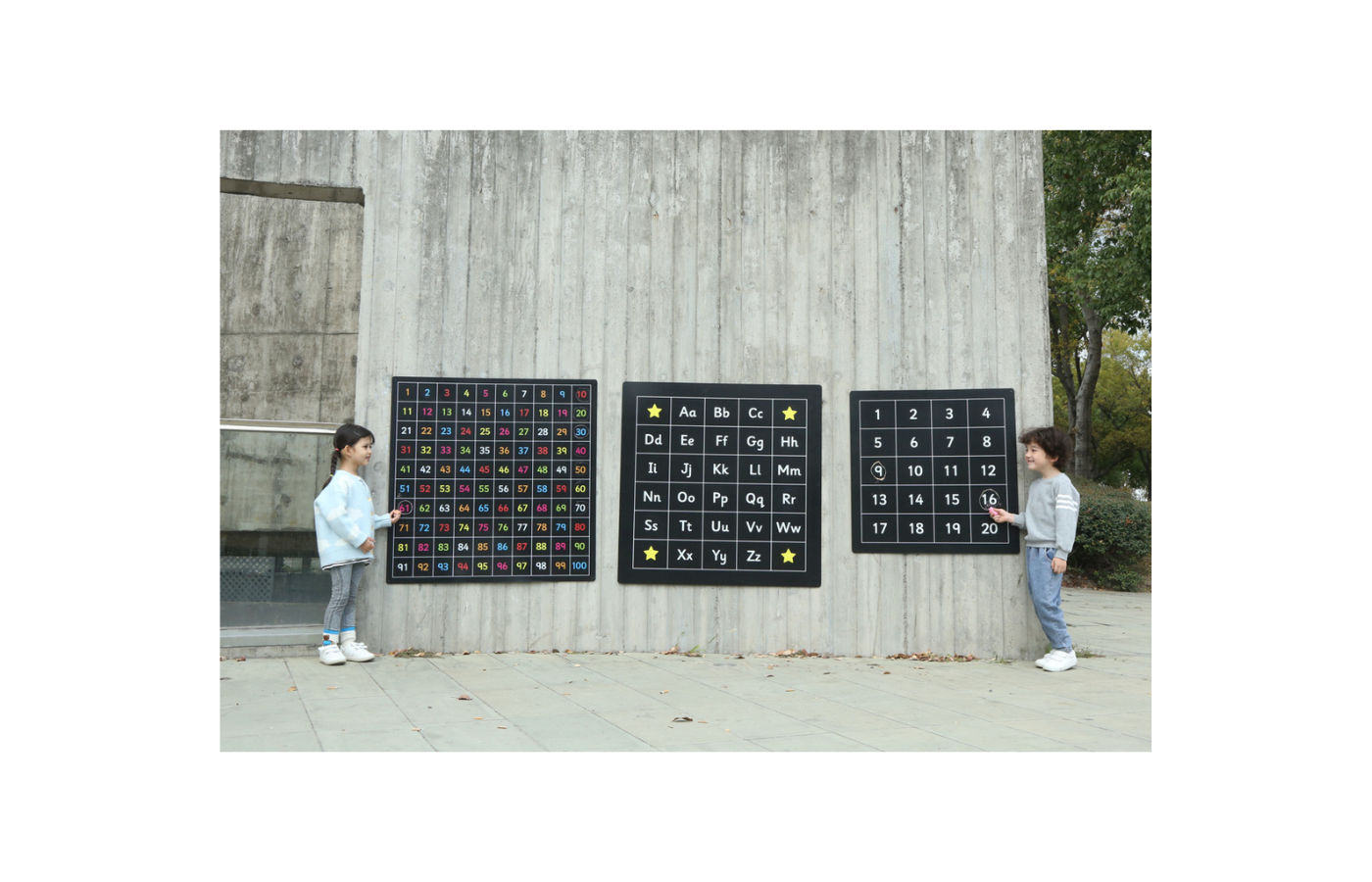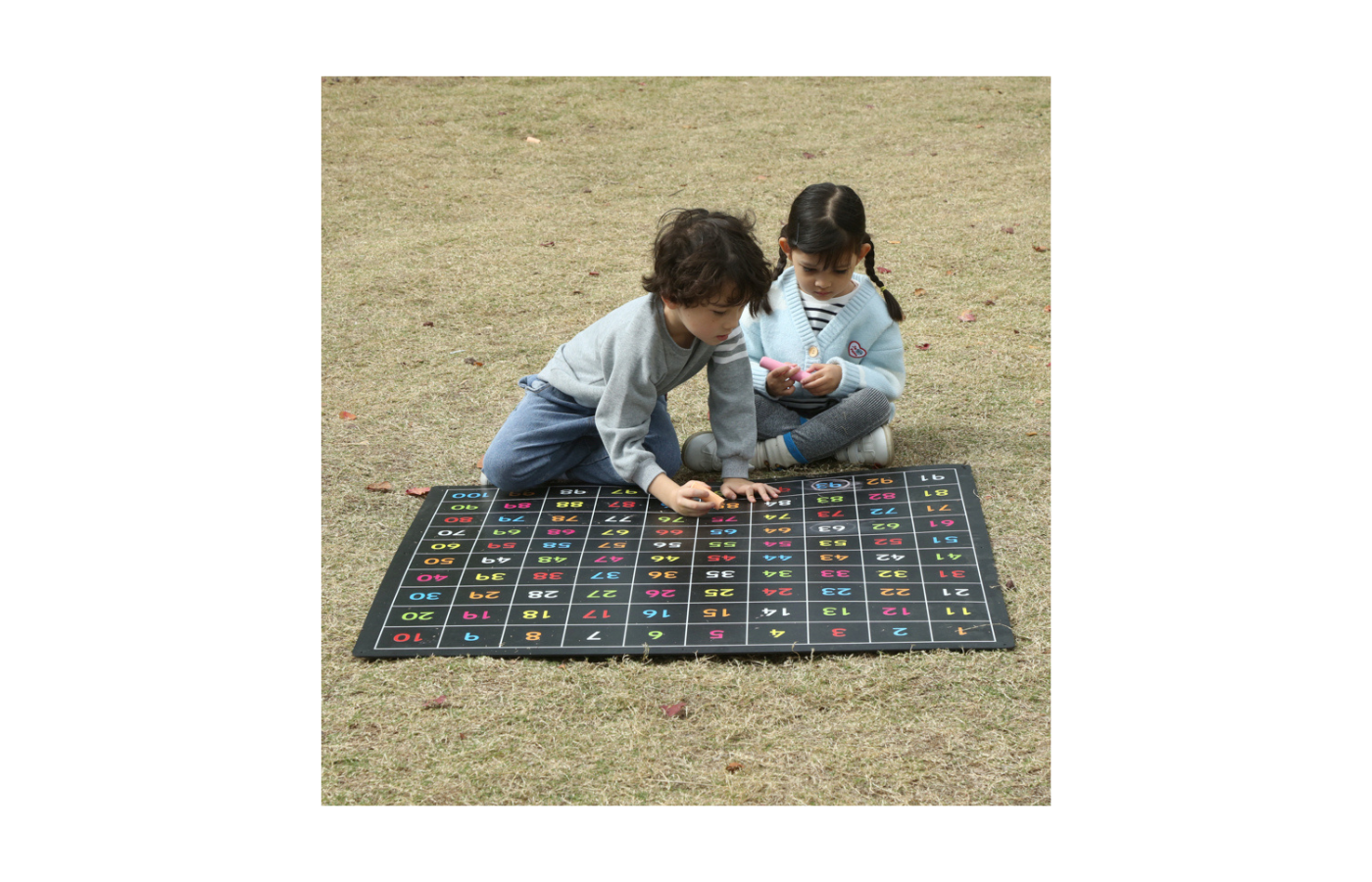 Een groot weerbestendig schoolbord met een ingevuld gekleurd 100-veld op getekend. Het krijtoppervlak maakt het praktisch voor interactieve wiskundeactiviteiten en spelletjes.
