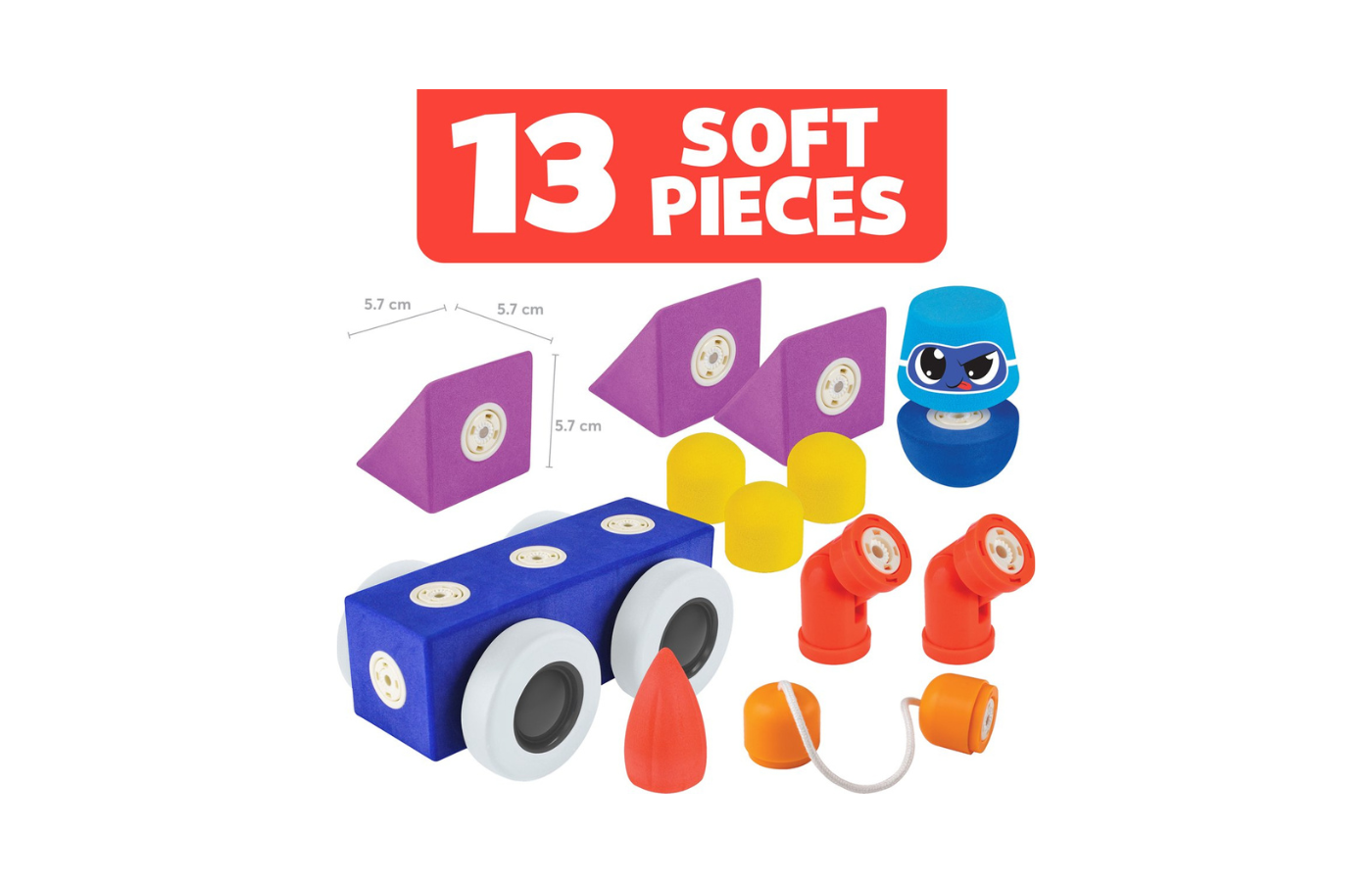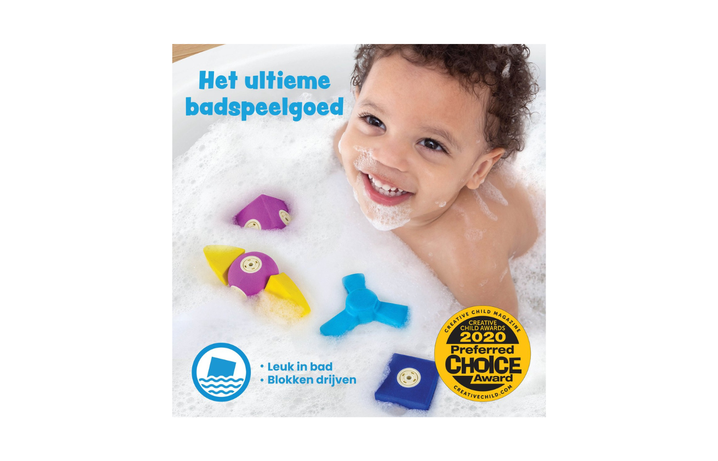Met deze zachte magnetische schuimrubberen bouwstenen kunnen kinderen creatiever bouwen dan ooit tevoren. Het innovatieve magneetsysteem verbindt de blokken elke keer op magische wijze met elkaar. De bouwstenen stoten elkaar nooit af en bieden eindeloze speelmogelijkheden! De schuimrubberen bouwstenen drijven op water en blijven magnetisch kleven aan metalen badkuipen. De blokken zijn gemakkelijk schoon te maken, ze kunnen gewoon in het bovenste vak van de vaatwasser – en ze blinken weer als nieuw!