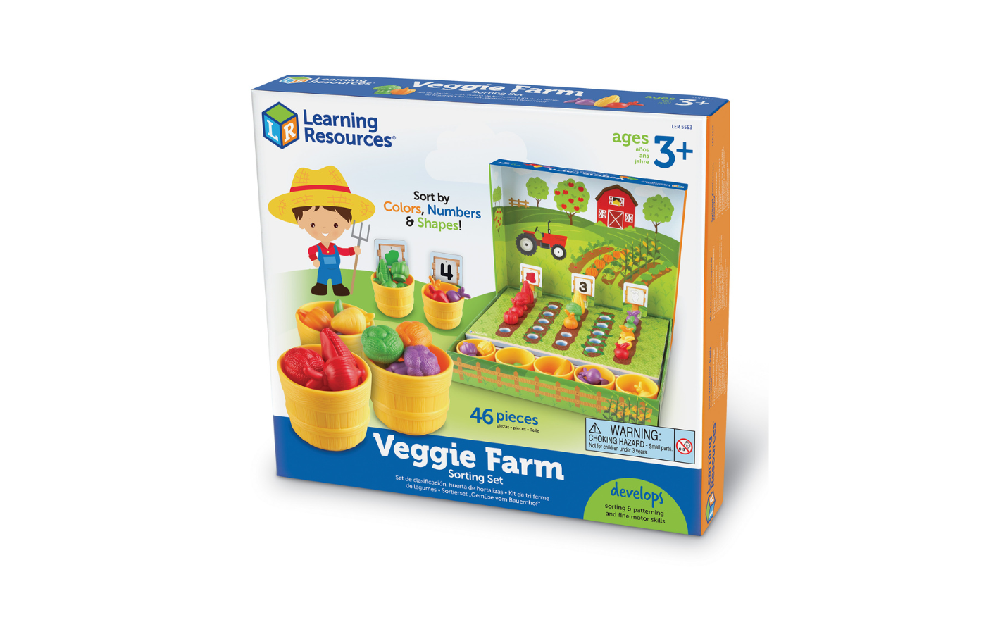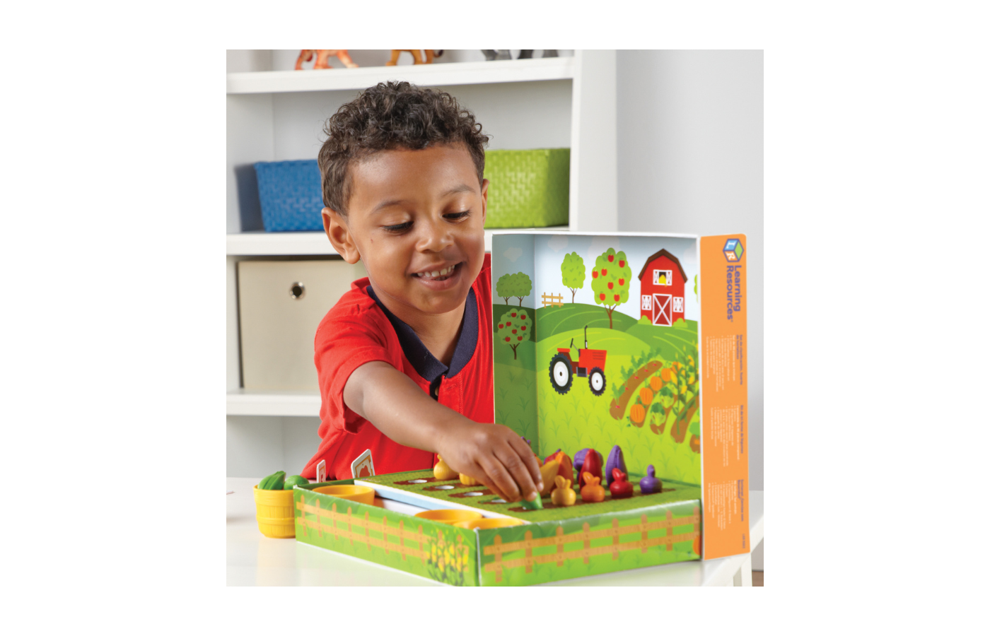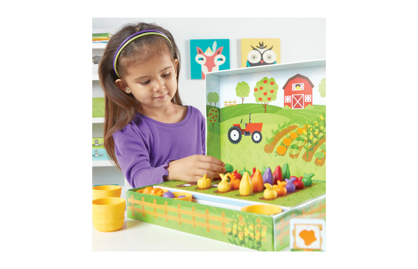 Deze kleurrijke activiteitenset in het thema boerderij zal een verscheidenheid aan wiskundige vaardigheden ontwikkelen. Kleurherkenning, sorteren, bij elkaar passen, tellen,... De box en de moestuin zijn ontworpen om een uniek 3D-tuintafereel te creëren.
