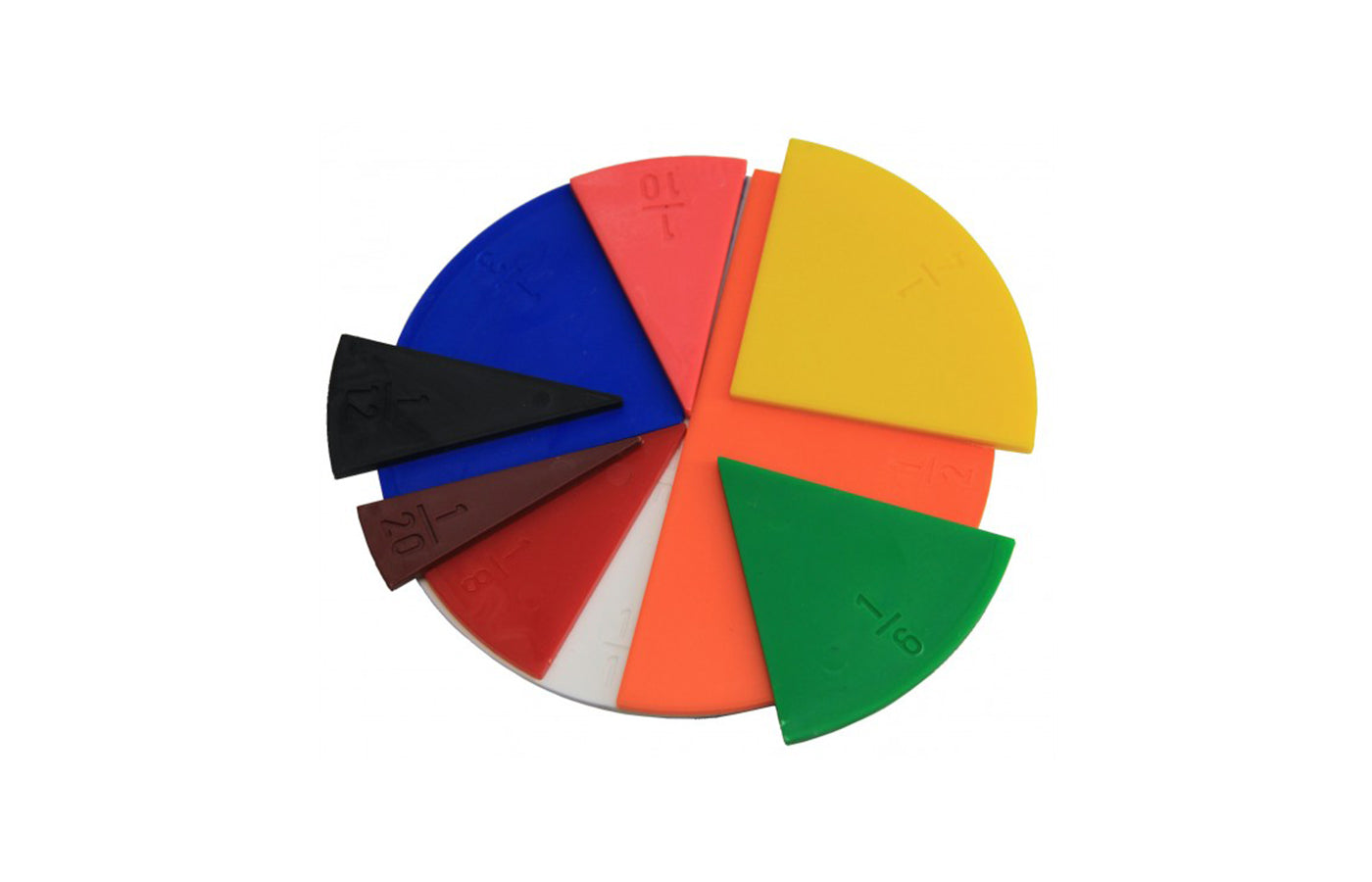 70 verschillende breuken in verschillende kleuren (1x 1/1, 2x 1/2, 3x 1/3, 4x 1/4, 5x 1/5, 6x 1/6, 8x 1/8, 10x 1/10, 12x 1/12 en 20x 1/20)