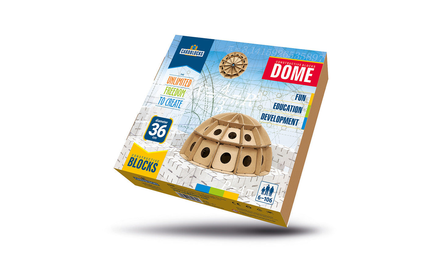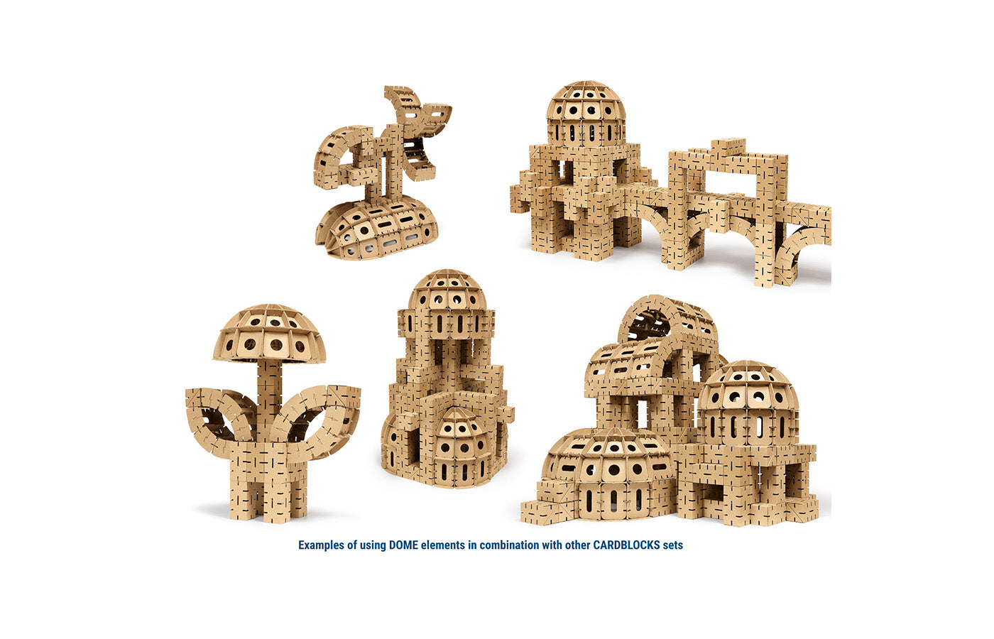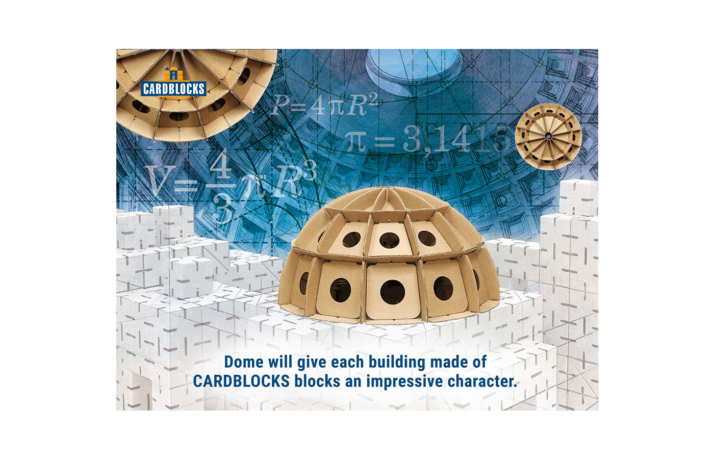Card Blocks zijn bouwblokken van karton om zelf in elkaar te zetten. De combinatie van een Block met een origineel ontwerp en een bijzondere Connector geeft ongekende mogelijkheden om ruimtelijke vormen te bouwen. De gemonteerde koepel heeft een diameter van 36 cm.