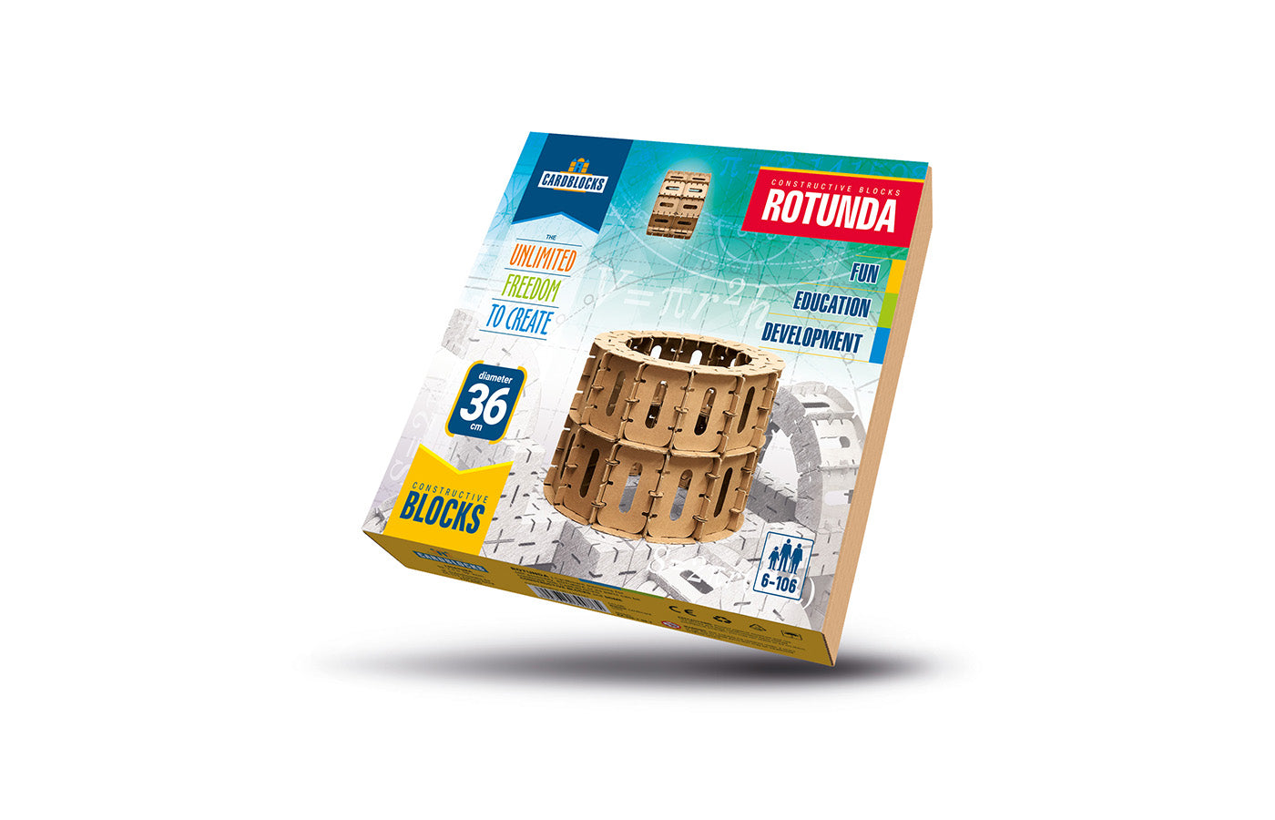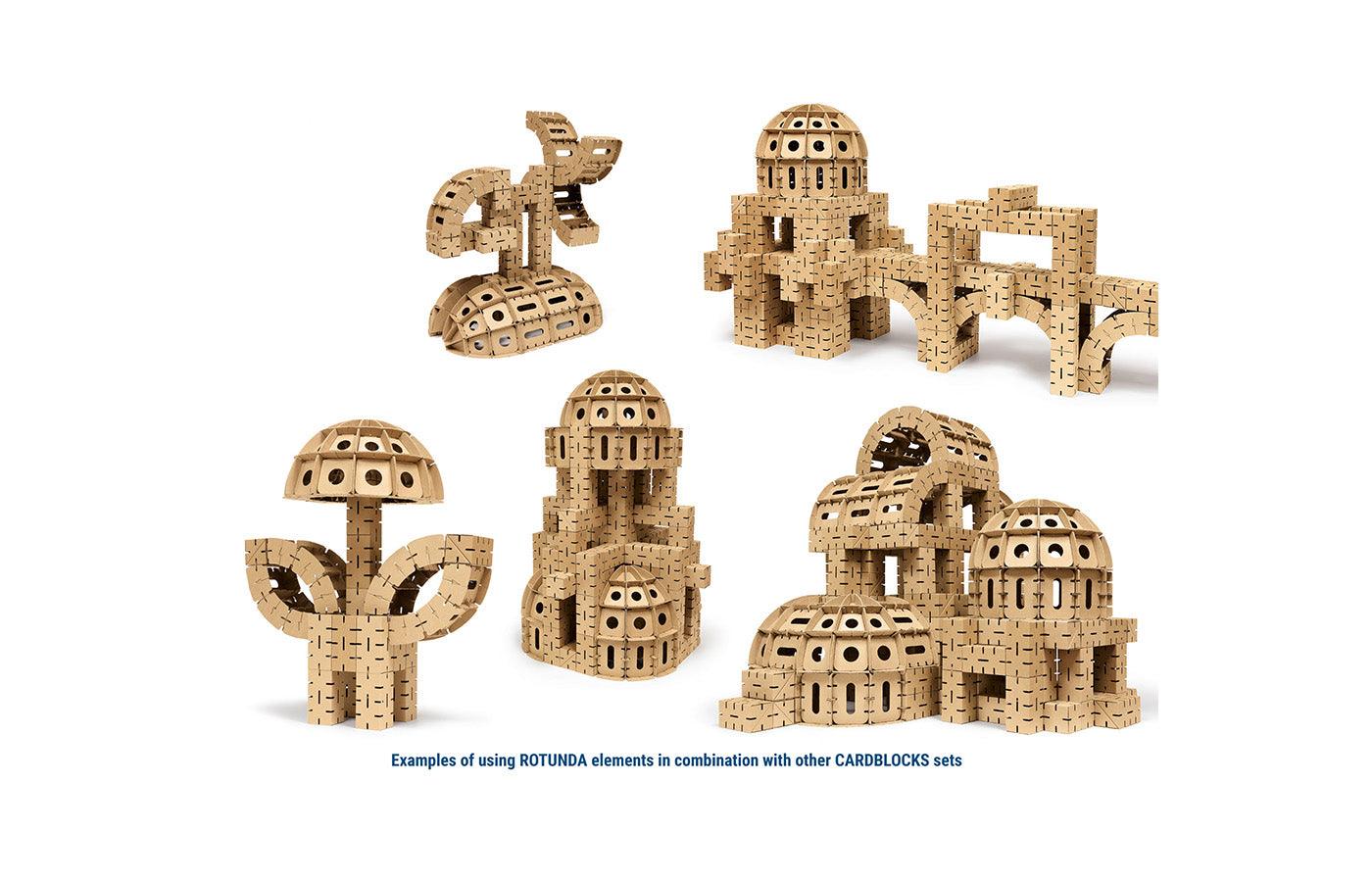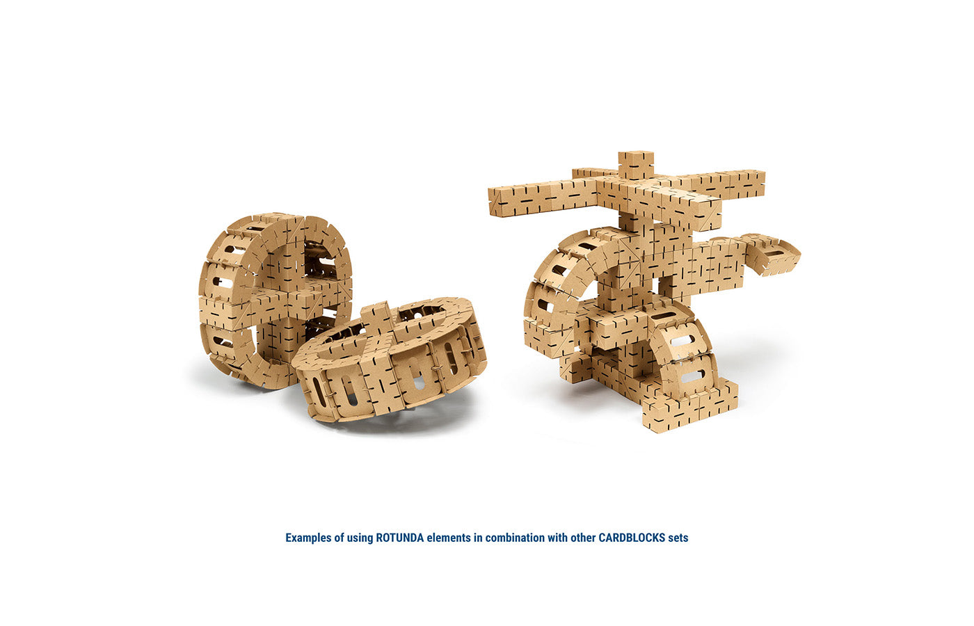 Card Blocks zijn bouwblokken van karton om zelf in elkaar te zetten. De combinatie van een Block met een origineel ontwerp en een bijzondere Connector geeft ongekende mogelijkheden om ruimtelijke vormen te bouwen. De gemonteerde rotonde heeft een diameter van 36 cm. Combineer verschillende sets om nog meer spectaculaire bouwwerken te maken.