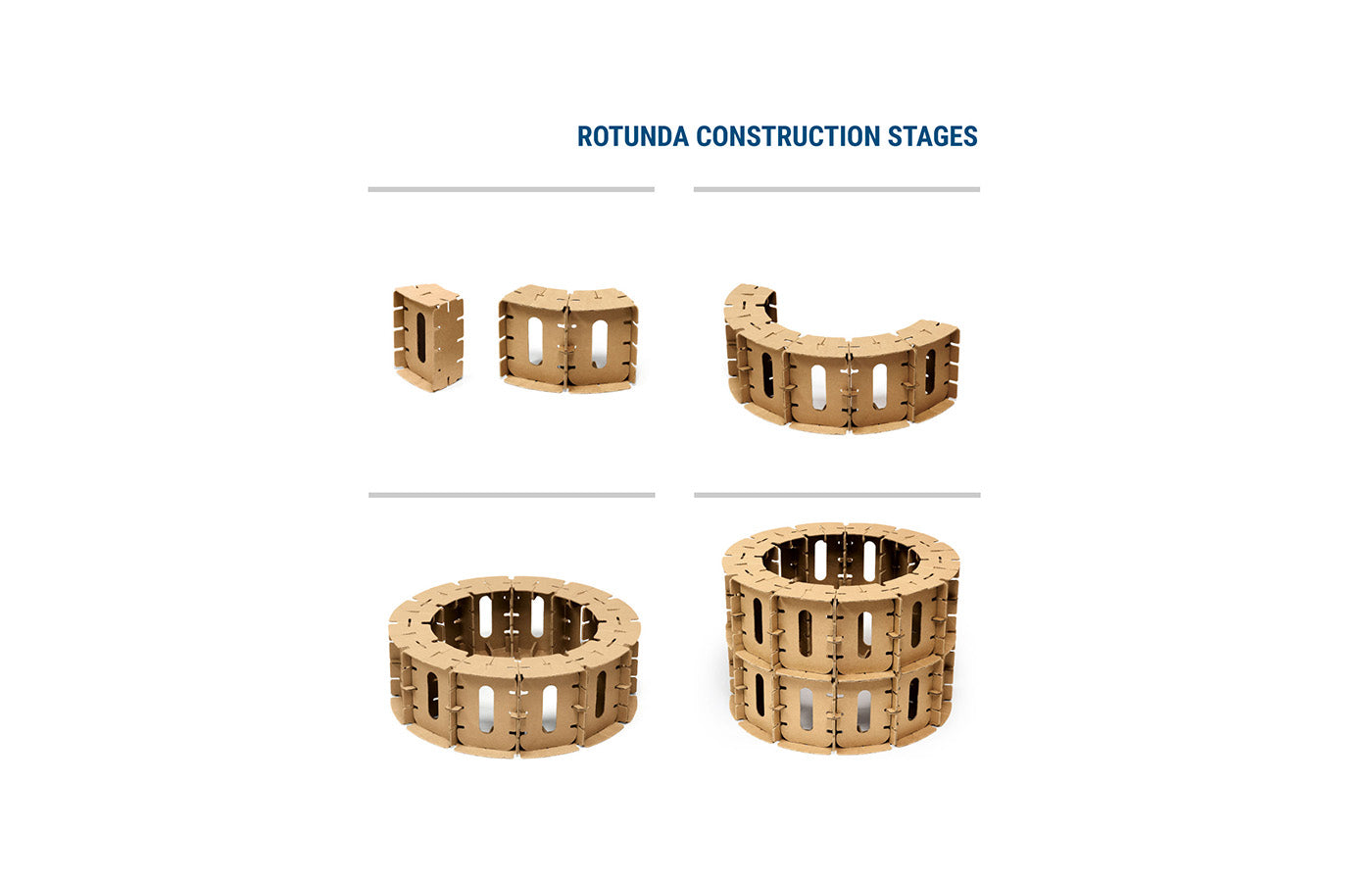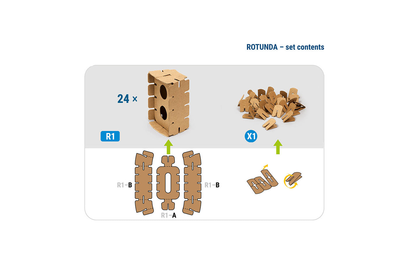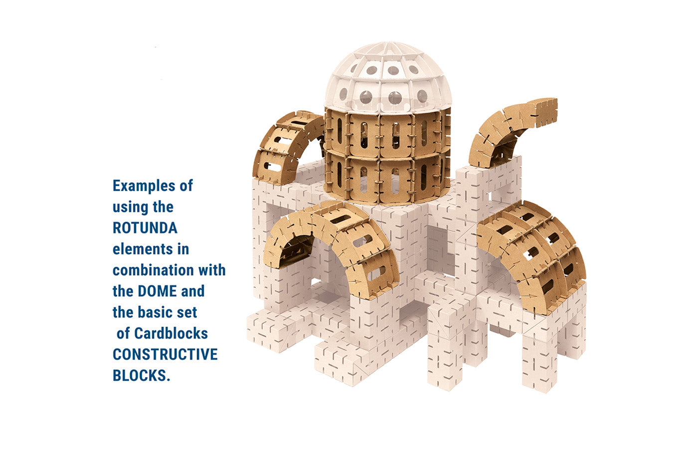 Card Blocks zijn bouwblokken van karton om zelf in elkaar te zetten. De combinatie van een Block met een origineel ontwerp en een bijzondere Connector geeft ongekende mogelijkheden om ruimtelijke vormen te bouwen. De gemonteerde rotonde heeft een diameter van 36 cm. Combineer verschillende sets om nog meer spectaculaire bouwwerken te maken.
