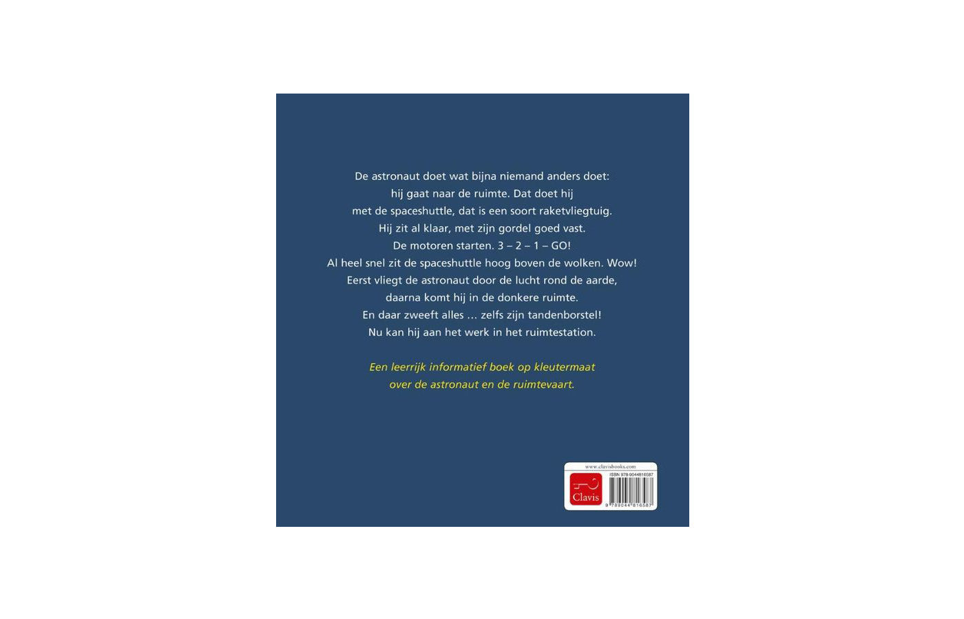 Een leerrijk informatief boek op kleutermaat over de astronaut en de ruimtevaart. De astronaut doet wat bijna niemand anders doet: hij gaat naar de ruimte. Dat doet hij met de spaceshuttle, dat is een soort raketvliegtuig. Hij zit al klaar, met zijn gordel goed vast. De motoren starten. 3 - 2 - 1 - GO! Al heel snel zit de spaceshuttle hoog boven de wolken. Wow! Eerst vliegt de astronaut door de lucht rond de aarde, daarna komt hij in de donkere ruimte. En daar zweeft alles... zelfs zijn tandenborstel! Nu kan hij aan het werk in het ruimtestation.