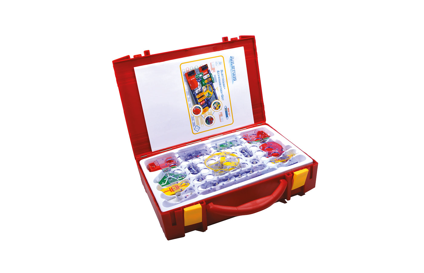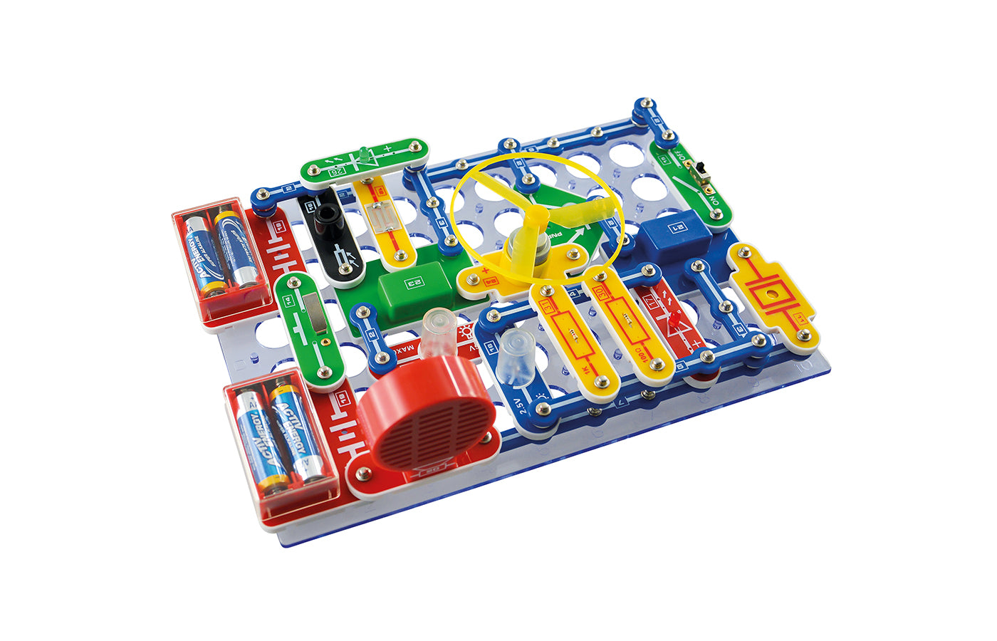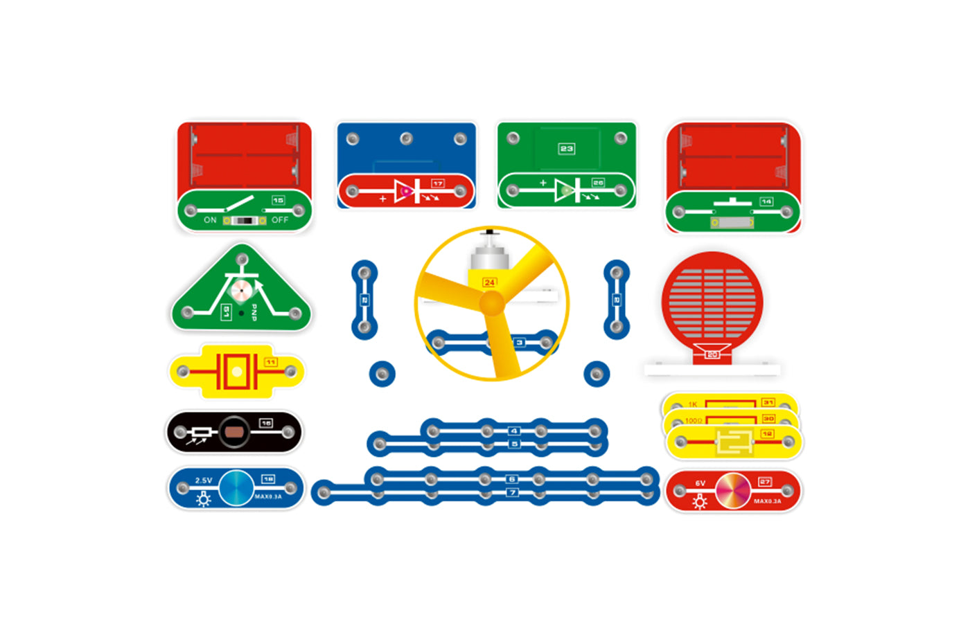 De elektronische componenten worden op een plexiglas plug-in-board gestoken. Als het circuit correct is, lichten lampen op en zijn er geluiden te horen.