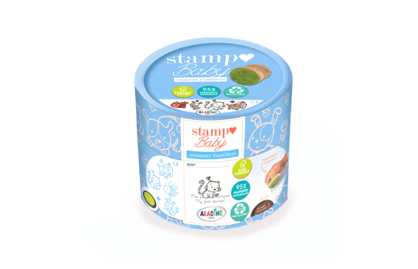 Set van 4 ergonomische houten stempels in het thema huisdieren, geschikt voor de handen van kinderen vanaf 18 maanden. Het FSC-hout is afkomstig uit duurzaam beheerde bossen. De verpakking bevat ook een inktkussen dat voldoet aan de huidige normen voor kinderen.