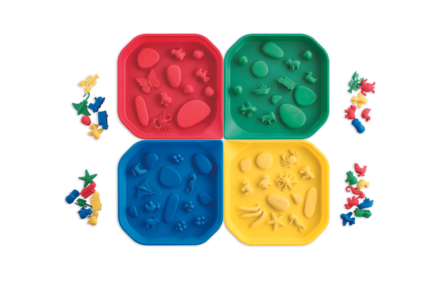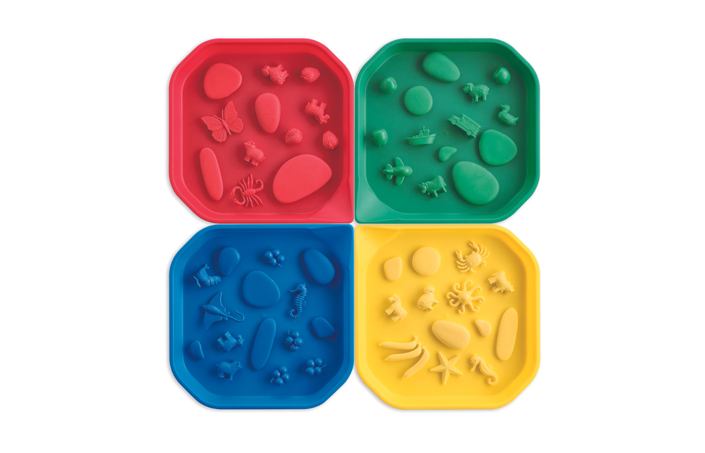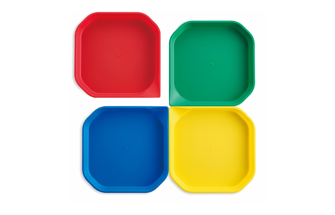 4 activiteitenbakjes - Messy Tray (rood, geel, groen en blauw) (afm. 25 x 25 x 2,5 cm)