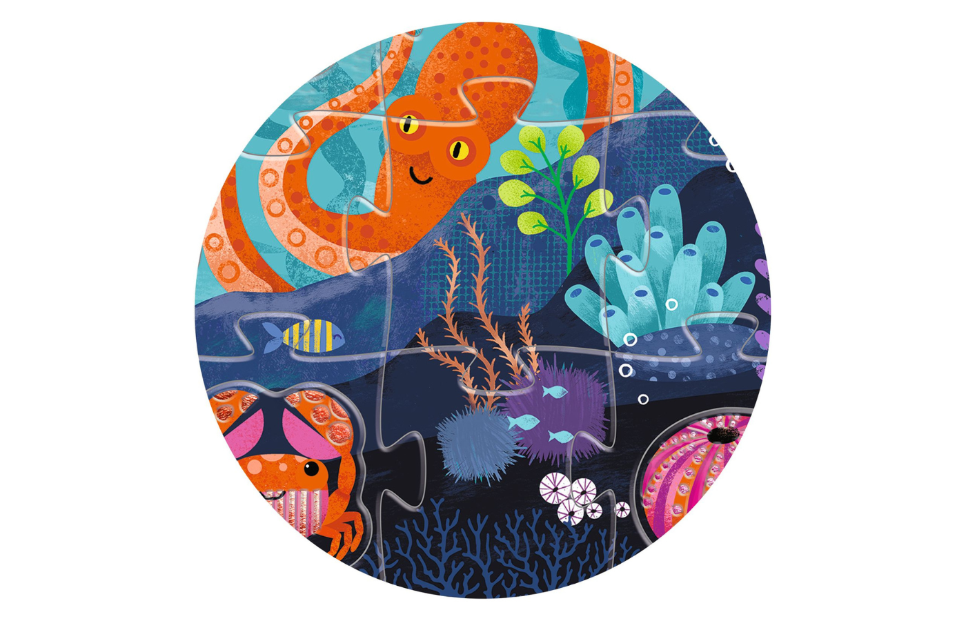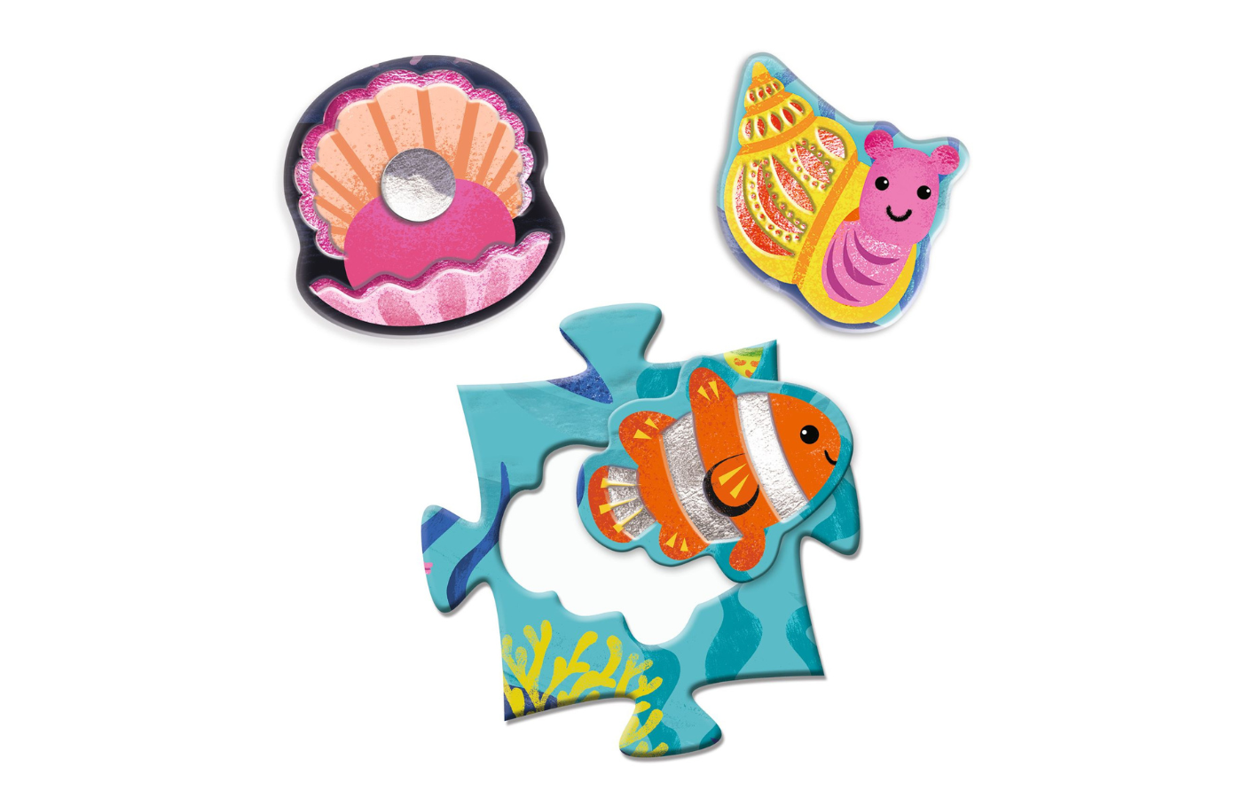 Grote legpuzzel van 32 stukken in het thema 'onder de zee'. Ook zijn er nog 8 stukken die apart uit de puzzel kunnen gehaald worden.