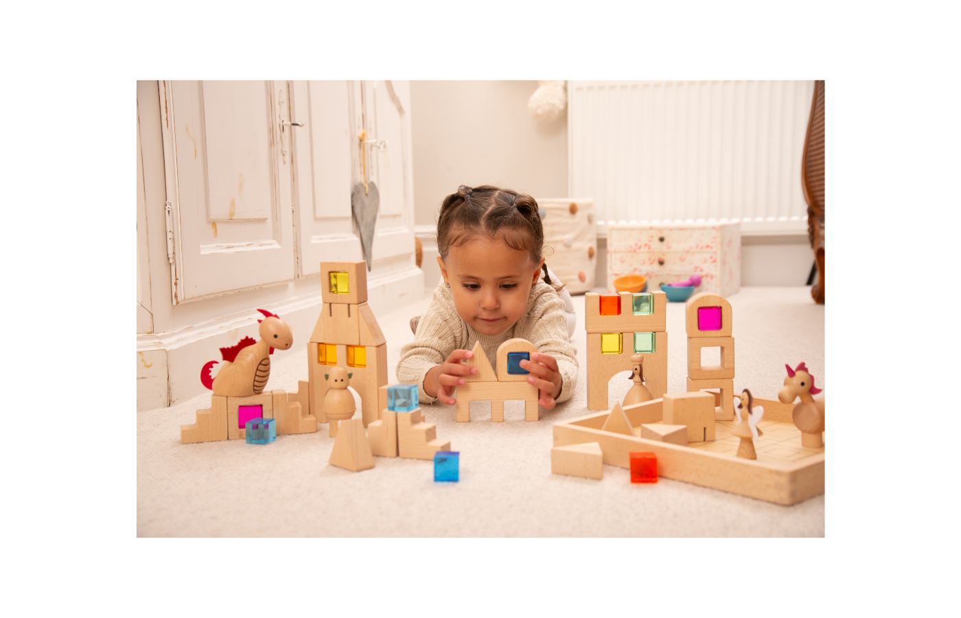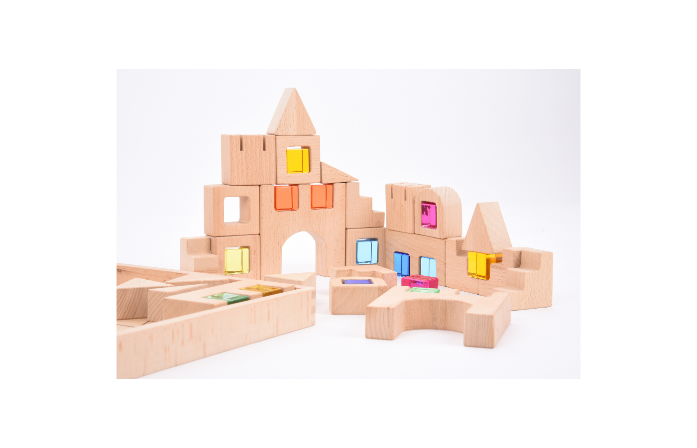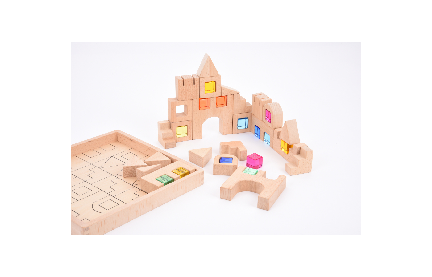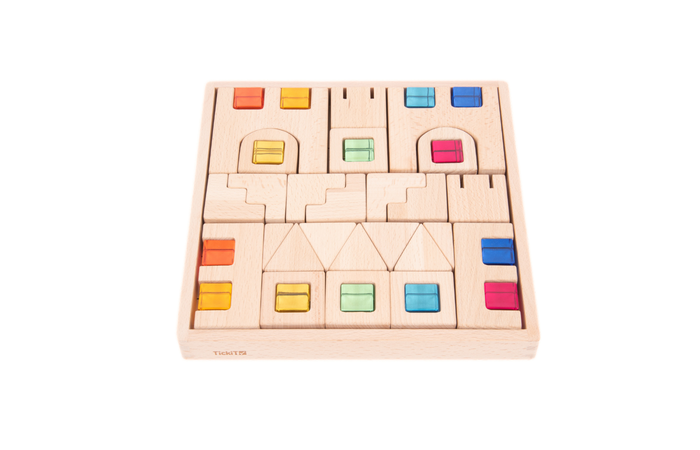 Gladde houten bouwblokvormen en kristalheldere kleurrijke edelsteenblokjes, verpakt in een stevige houten tray met afgetekende lijnen in de multiplex bodem zodat je de blokken eenvoudig kan opruimen.