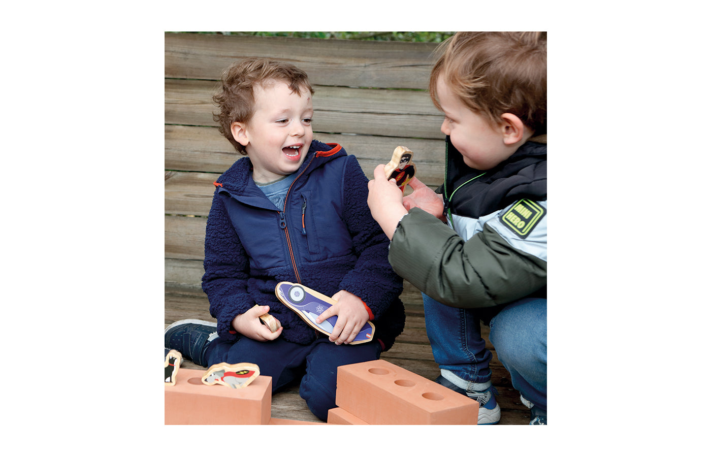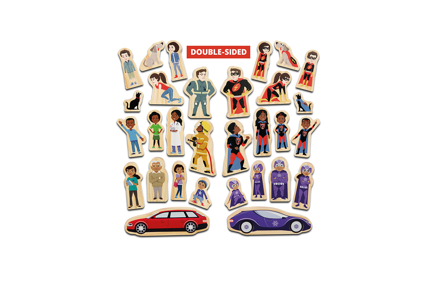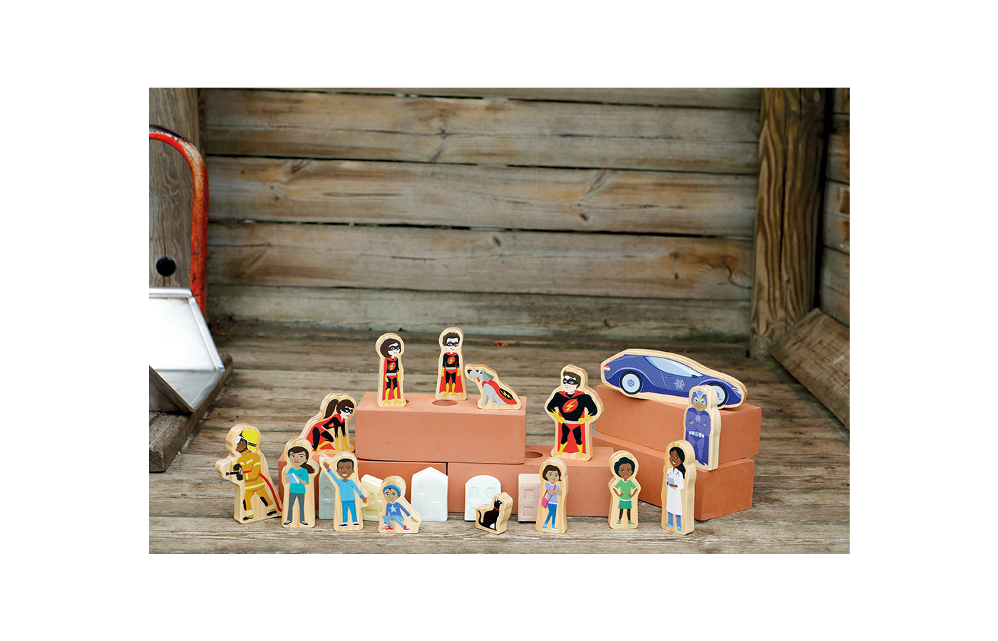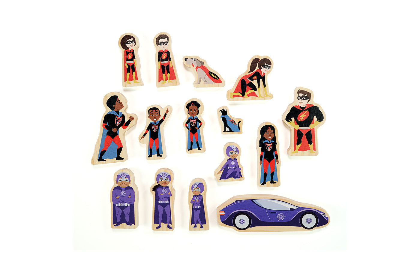 Deze multiculturele set superhelden bestaat uit 3 families, waarvan elk lid kan worden getransformeerd van hun alledaagse personage tot superheld. Elk speelfiguur is 15 mm dik waardoor het makkelijk kan blijven rechtop staan. Ze zijn gemaakt van natuurlijk FSC-gecertificeerd dennenhout en zijn tussen de 5 en 12 cm hoog.