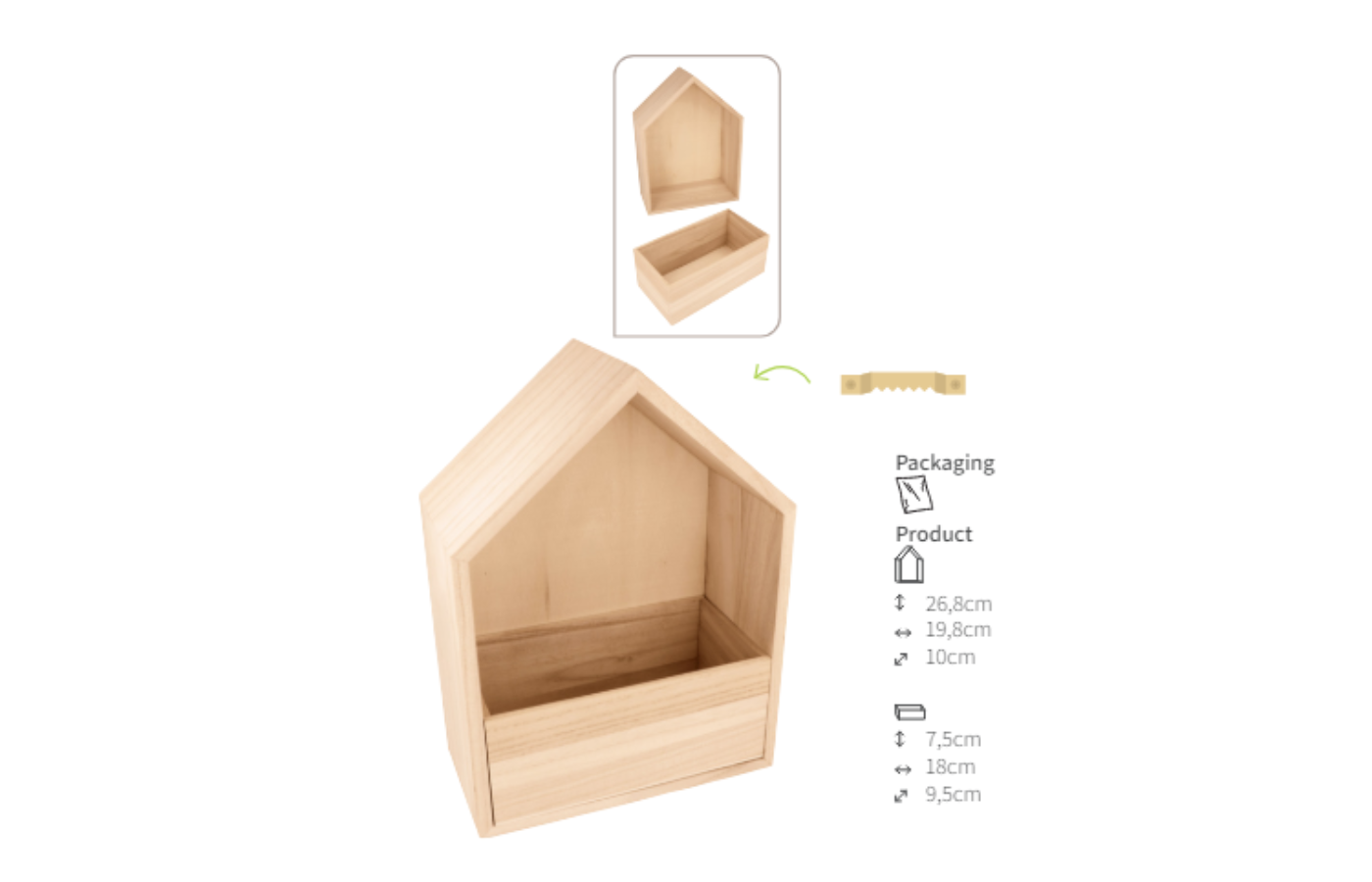Mooi (kalender)huis met lade te gebruiken om de dagen van de week visueel voor te stellen. In de lade van het huis kan ook nog materiaal ingestopt worden. Het huis kan geschilderd worden. Ook allerlei sorteeroefeningen kunnen uitgevoerd worden in combinatie met dit leuke huisje.