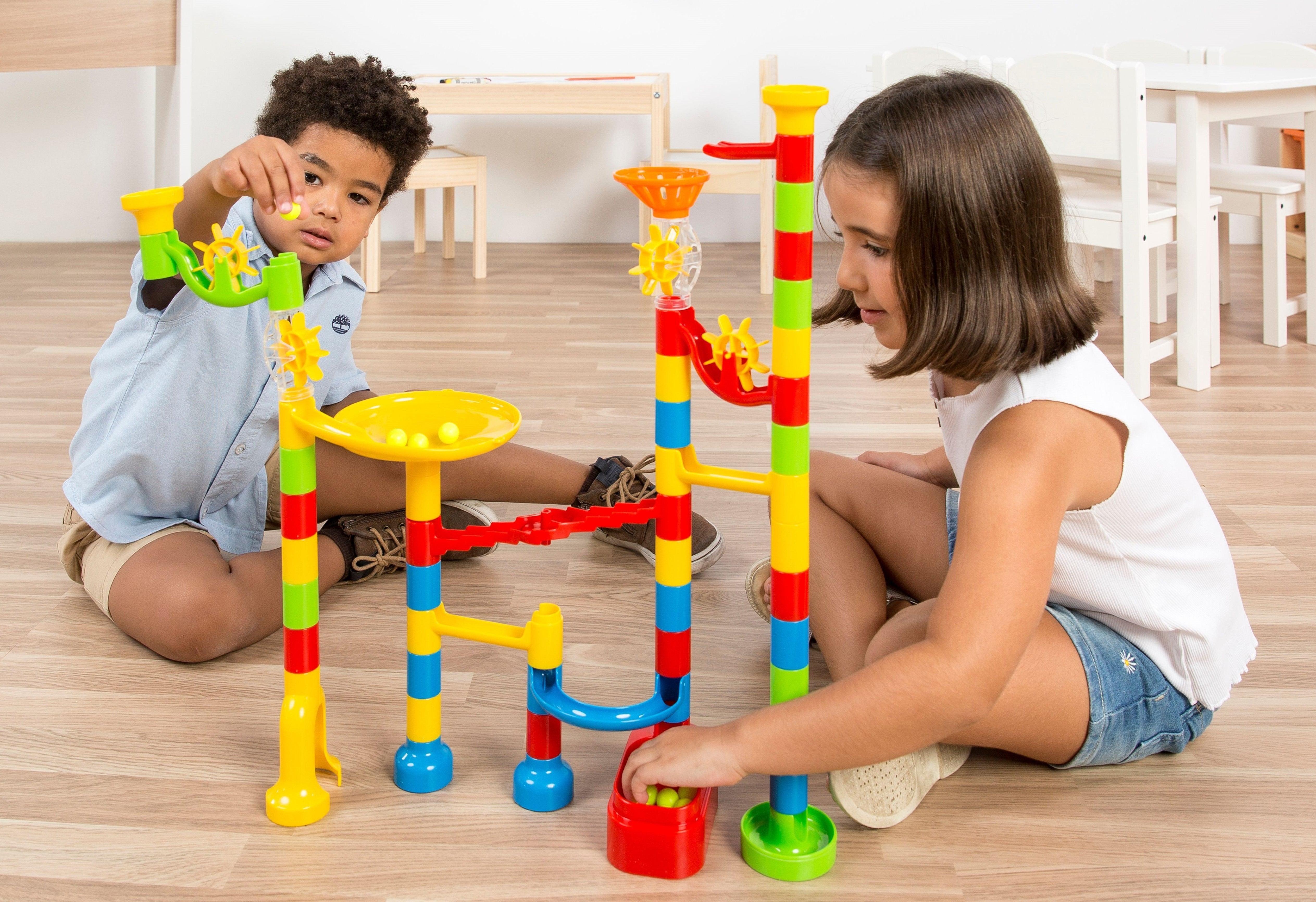 Een leuke knikkerbaan waarbij kinderen verschillende constructies kunnen maken. De set bestaat uit verschillende onderdelen zoals buizen, draaikolken, tandwielen, balletjes, ...