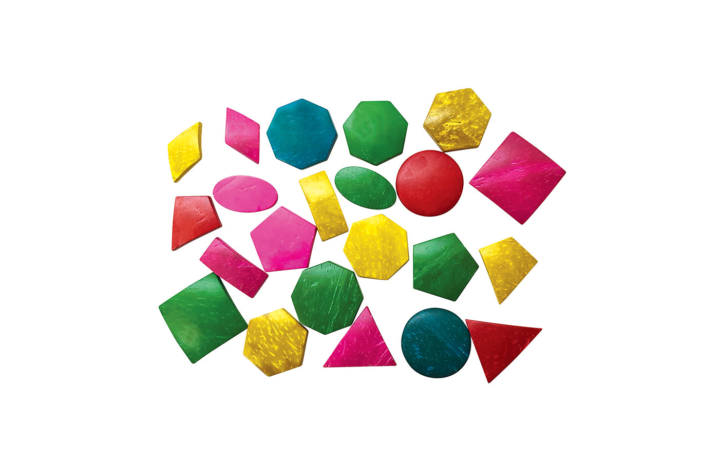 Een zakje van 22 kokosnoot schelpen - geometrische vormen in verschillende kleuren. Te gebruiken als decoratie, om te tellen of om mee te knutselen.