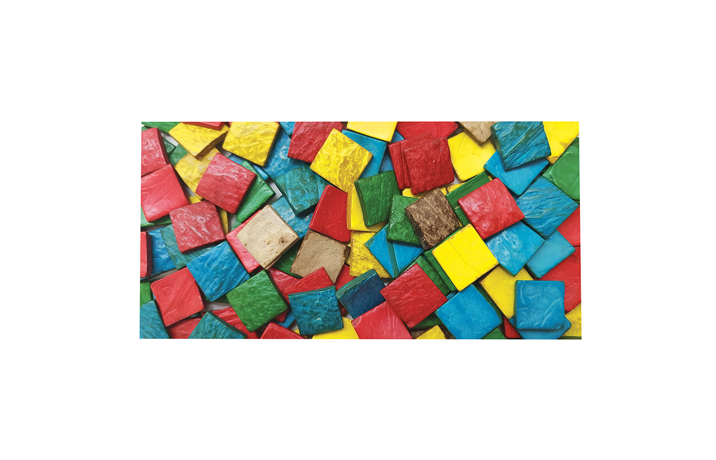 Een zakje van 150 gr. kokosnoot schelpen - vierkanten in verschillende kleuren. Te gebruiken als decoratie, om te tellen of om mee te knutselen.