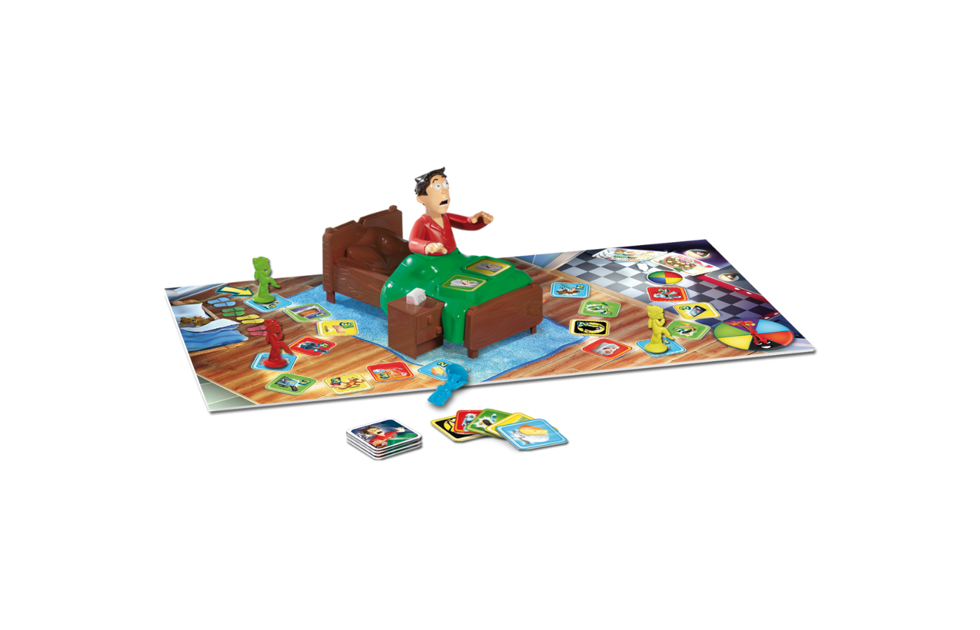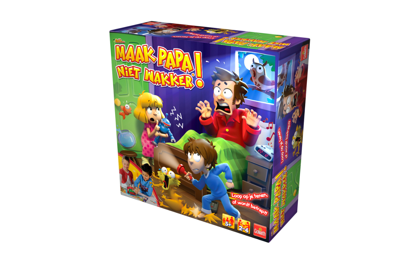 Zet het bord in het midden van de tafel en leg Papa op het bed in z'n slaappositie. Zet hem nu aan en hoor hem snurken. Iedere speler kiest nu een kleur figuur en de kaartjes worden geschud en verdeeld onder de spelers. Op het bord zie je allerlei verschillende gebeurtenissen die Papa wakker zouden kunnen maken, zoals het vallen van borden, de kat wordt opgeschrikt enzovoorts. Op de kaarten die de spelers hebben gekregen zie je deze gebeurtenissen weer terug. Als je op een vakje belandt waarvan jij dezelfde gebeurteniskaart hebt, dan ben je beschermd en hoef je niet op de knop te drukken. Maar heb je deze beschermkaart niet, dan moet je het aantal keer op de knop naast Papa z'n bed drukken als staat aangegeven op het bord. Pas wel op! Want als Papa wakker schrikt tijdens jouw beurt, word je weer naar bed gestuurd! Wie het eerste bij de koelkast aankomt is de winnaar.