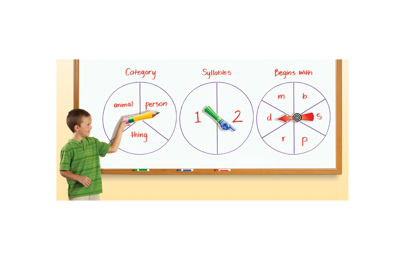 Voeg een leuke draai toe aan uw klasactiviteiten! Gebruik deze drie gigantische grote spinners om van uw whiteboard een spel of activiteit op maat voor de hele klas te maken. Teken een cirkel, schrijf inhoud, bevestig een spinner en speel!