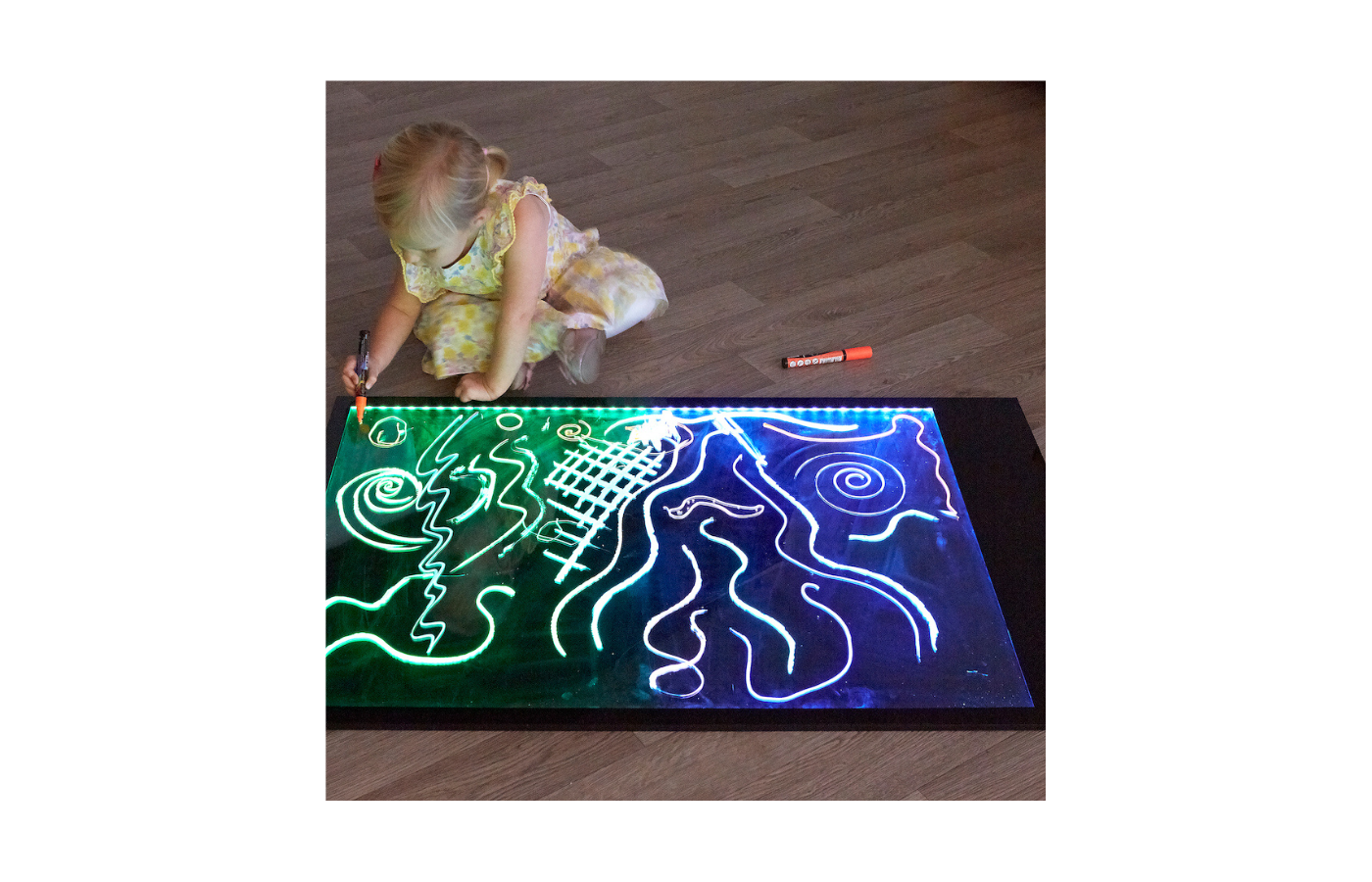Een mega sensorisch verlicht schrijfbord, ideaal om te gebruiken bij voorbereidend schrijven of je kan er ook vrij op tekenen. Het schrijfbord kan ingesteld worden in 7 verschillende kleuren. De linker- en rechterkant kunnen apart worden ingesteld. Zeer geschikt om met meerdere kinderen samen te werken.