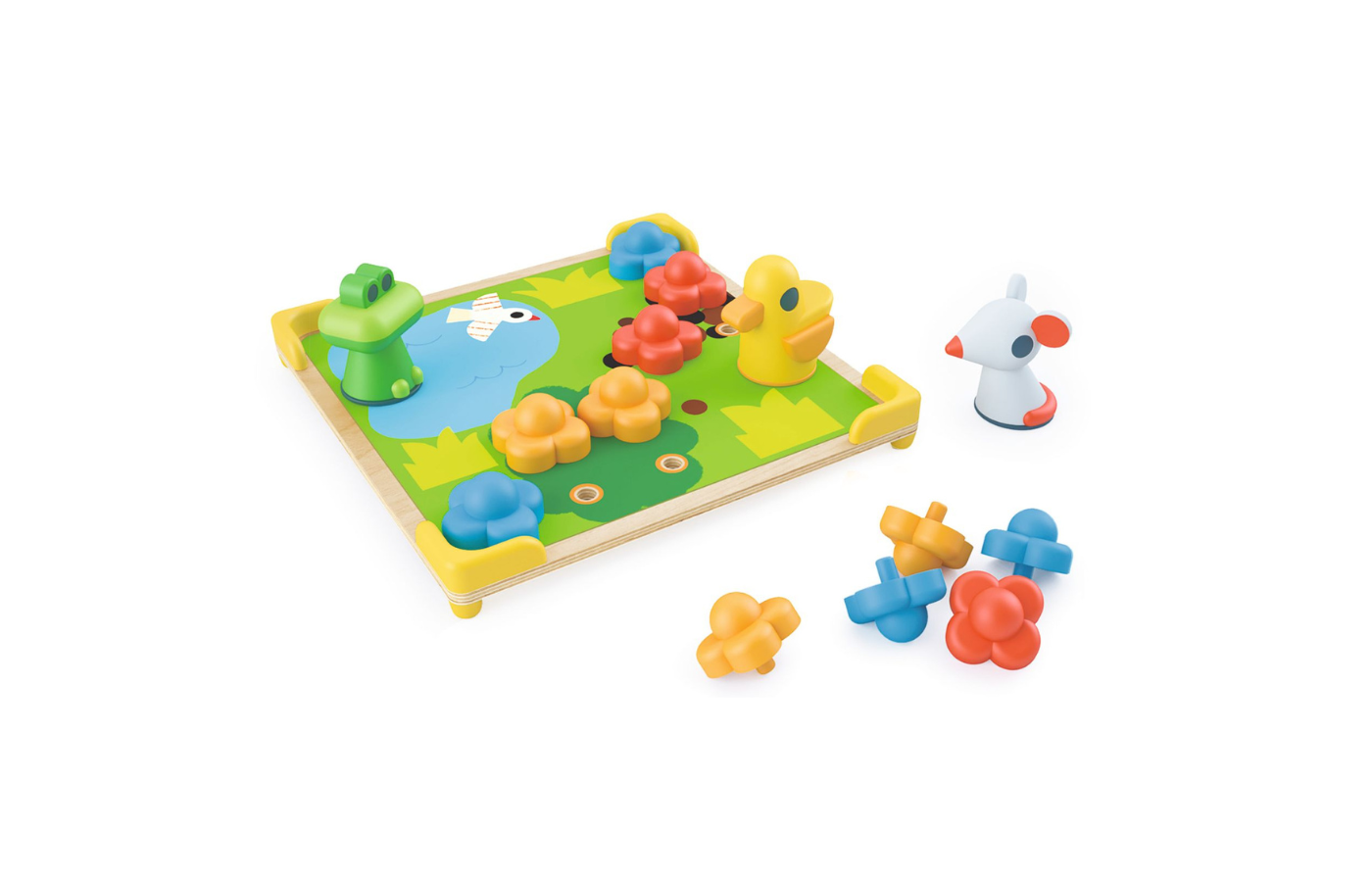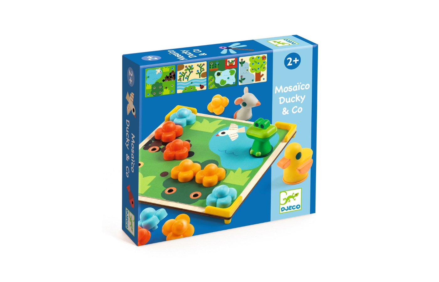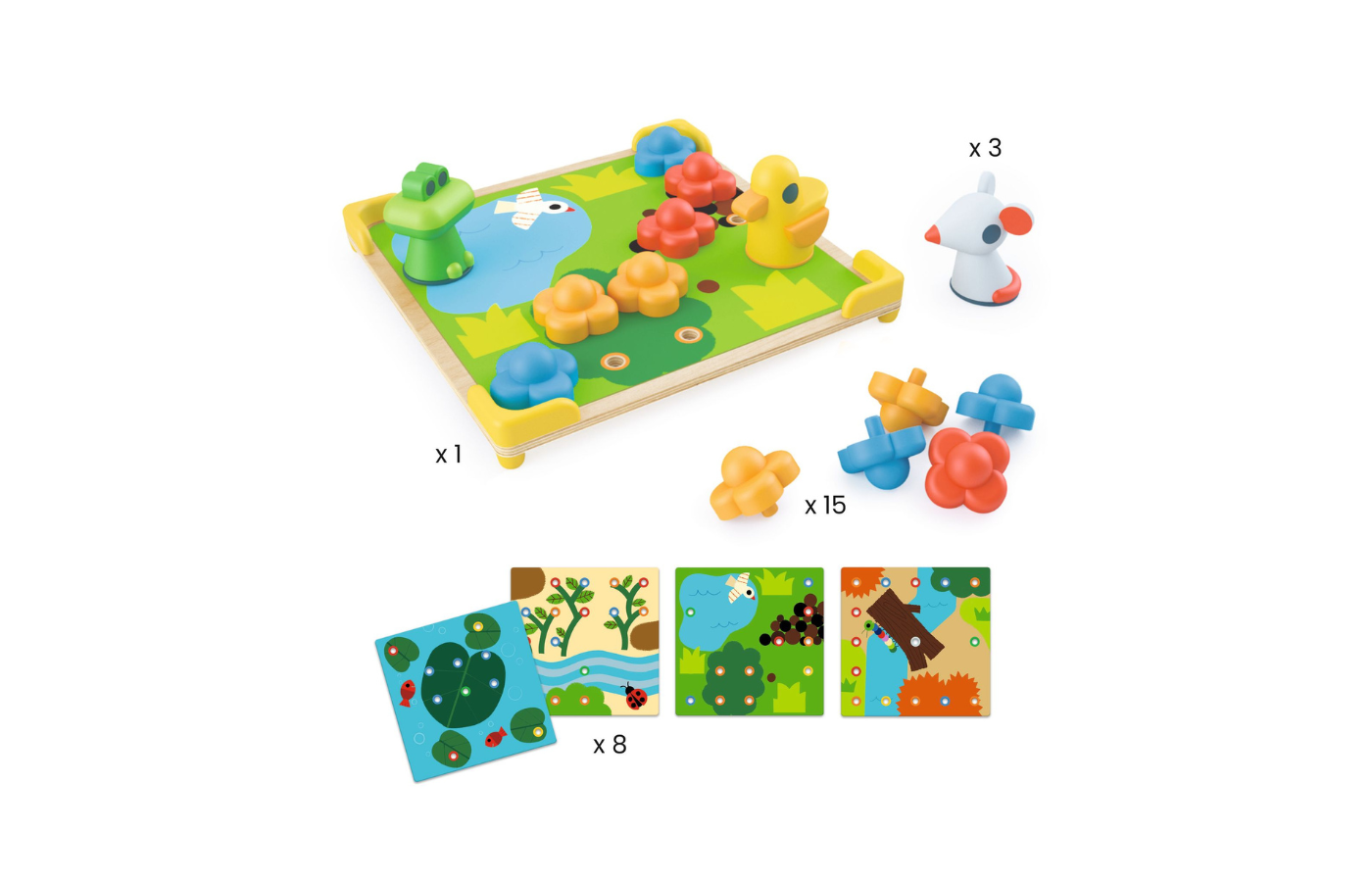 Met deze mozaïek puzzel Mosaïco Ducky & Co maken jonge kinderen kleine tafereeltjes van bloemen en dieren. Leg één van de sjablonen op de houten plank en plaats de bloemen en dieren met de nopjes op de juiste plaats. De kleuren van de bloemen en dieren staan reeds aangegeven op de sjablonen om zo kinderen op weg te helpen in hun zoektocht.