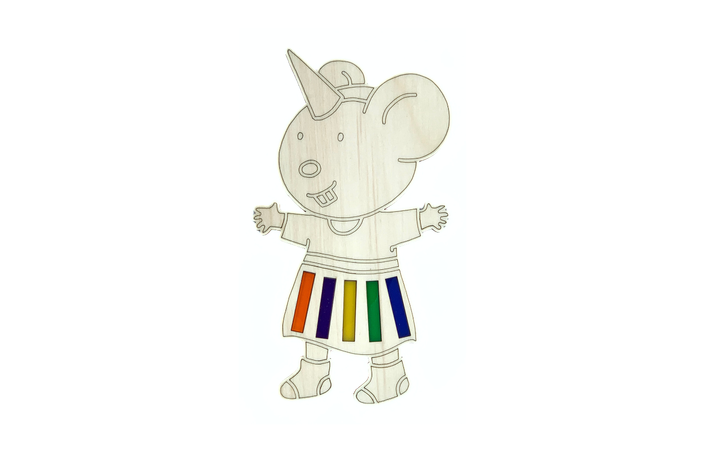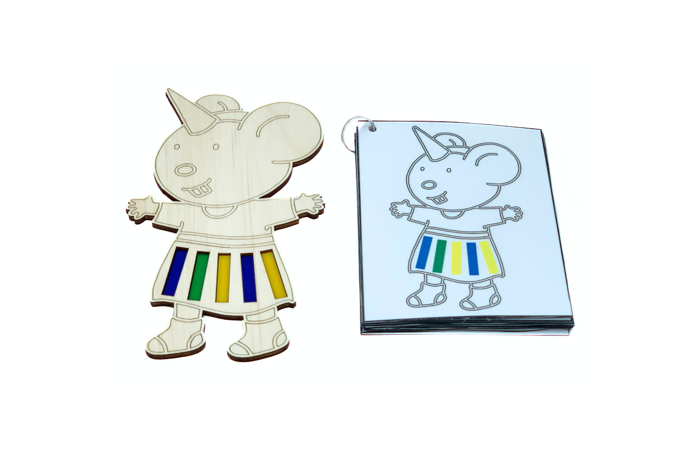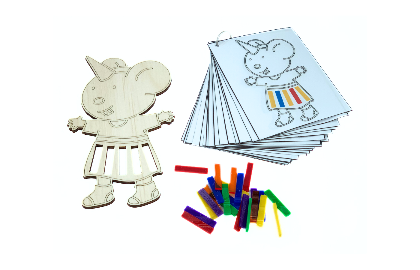 Fijnmotorisch spel met betrekking op ruimtelijke oriëntatie. De kinderen leggen de acrylvormen in de openingen (rok) van Rosie op basis van een opdrachtkaart. Zeer leuk om te gebruiken op het lichtpaneel. Te combineren met het boek Iedereen kan een eenhoorn zijn.
