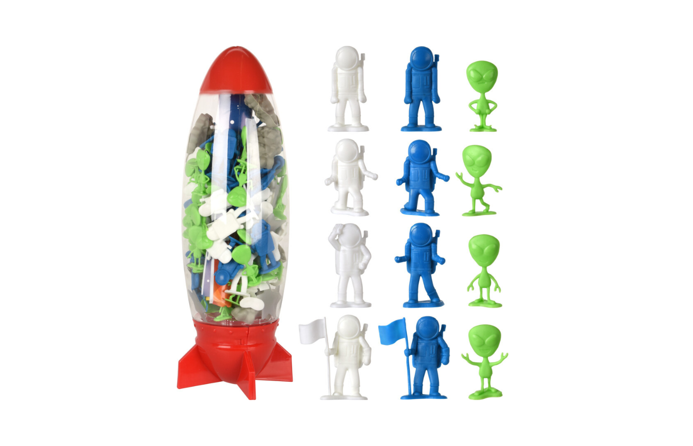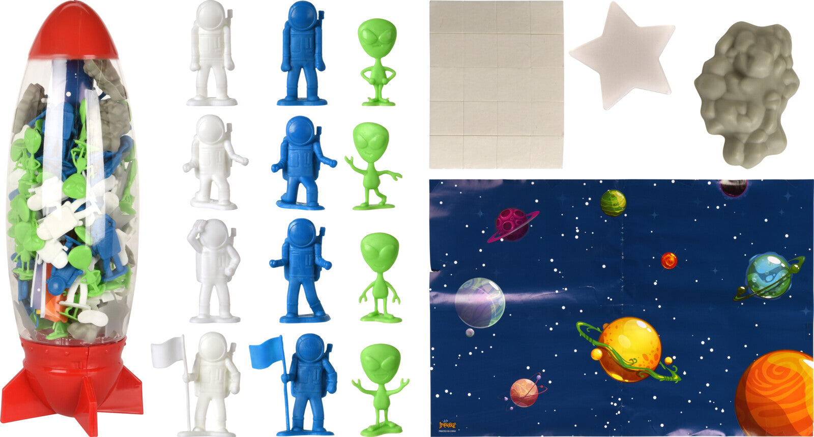 Leuke speelset in het thema ruimte met 125 verschillende speelfiguren. Handige opbergdoos in de vorm van een raket.
