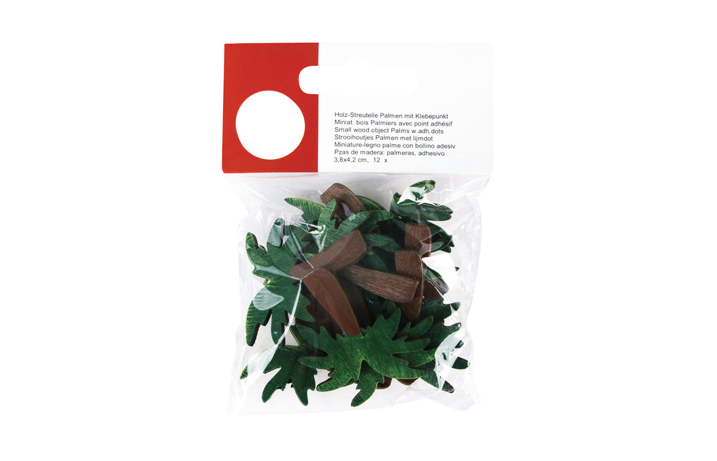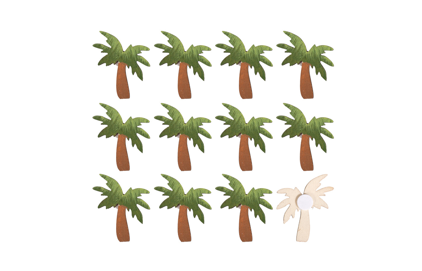 Een zakje met 12 houten strooihoutjes van palmbomen. De achterkant is zelfklevend, verwijder eenvoudig de folie en kleef de figuurtjes waar je maar wil. Te gebruiken als decoratie of om mee te knutselen.