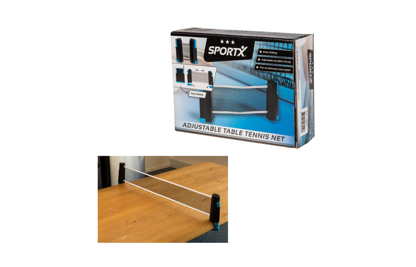 Tafeltennisnet, dat je gemakkelijk uit kunt schuiven en op een tafel kunt klemmen. Zo kun je overal een potje tafeltennis spelen!