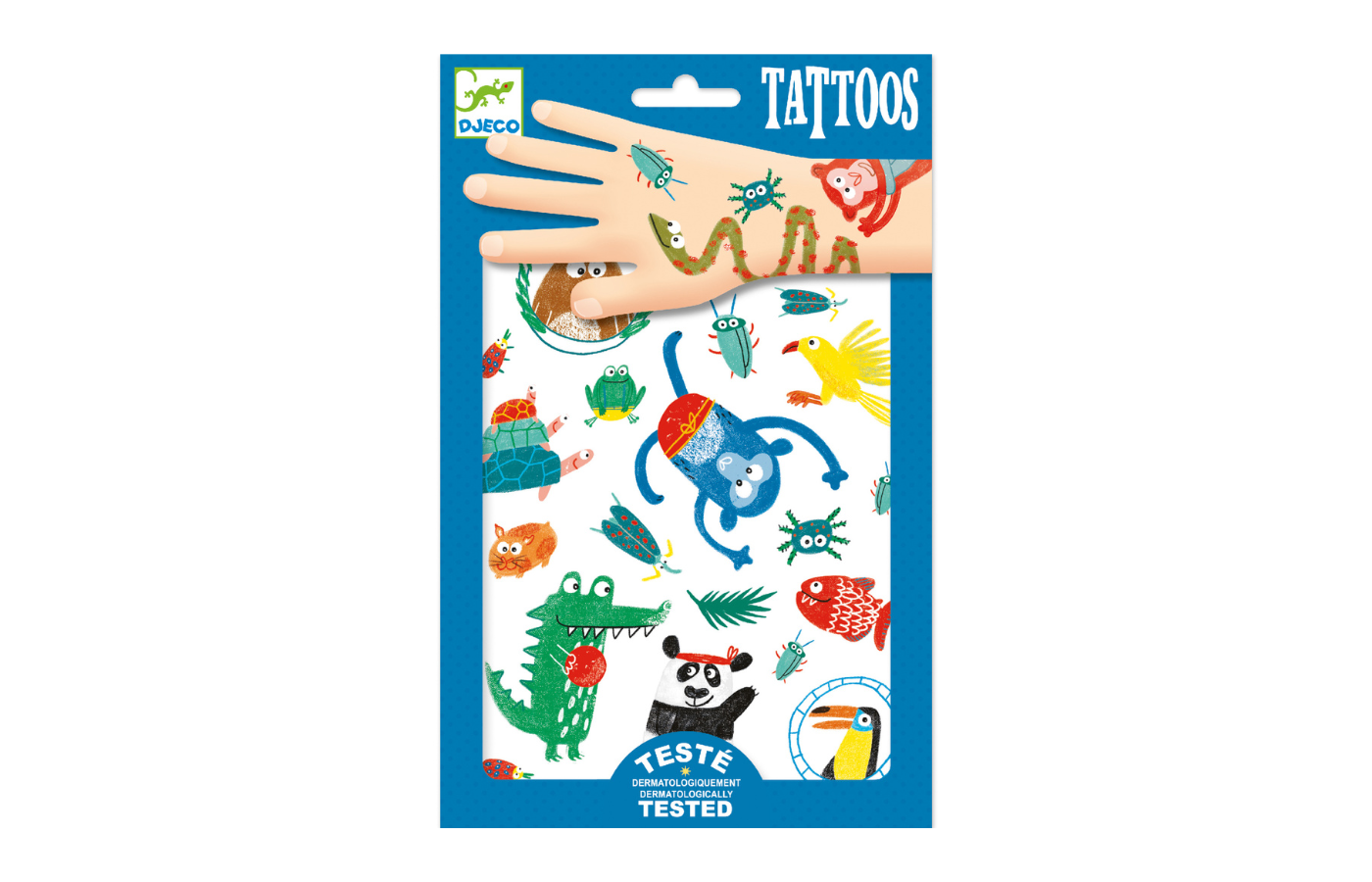 Twee stickervellen met tattoos om de huid mee te versieren. Knip het gekke dier van je voorkeur uit en breng hem aan op je huid. De tattoos zijn dermatologisch getest.