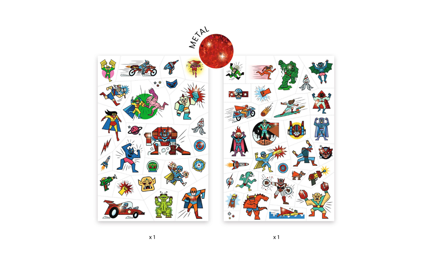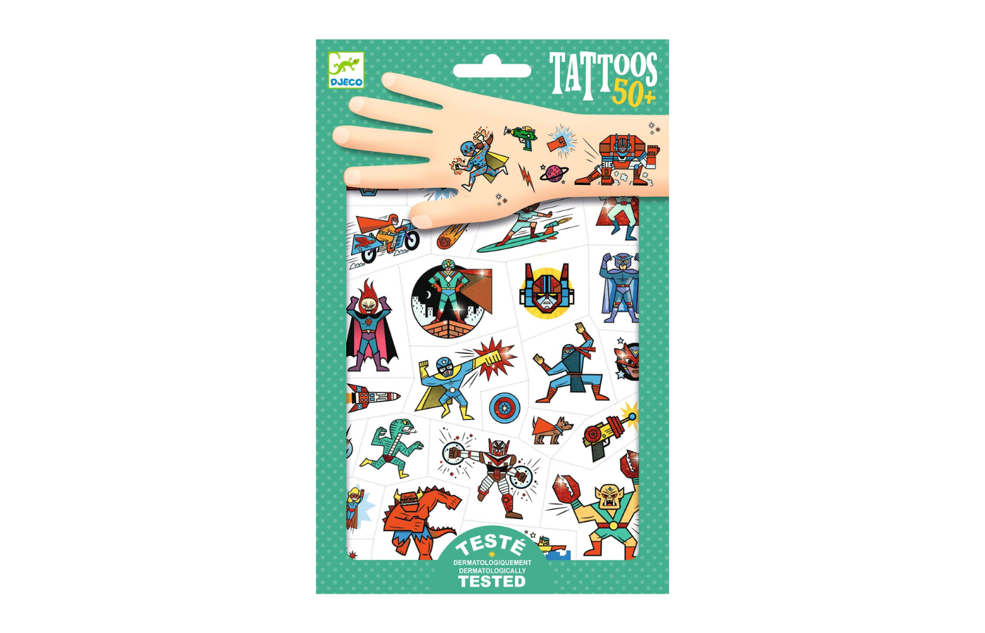 Twee stickervellen met tattoos om de huid mee te versieren. Knip de superheld van je voorkeur uit en breng hem aan op je huid. De tattoos zijn dermatologisch getest.