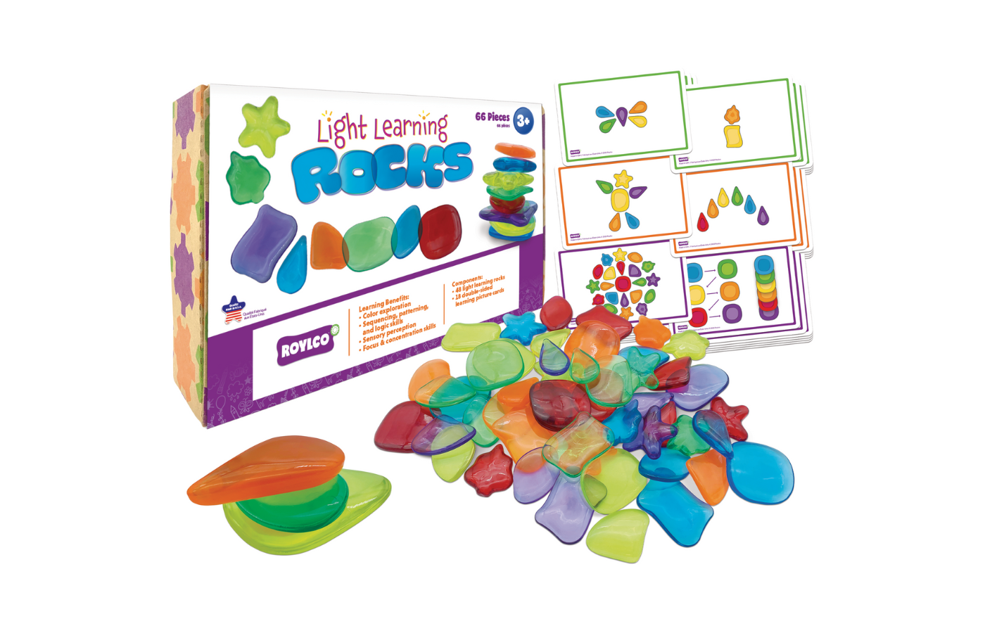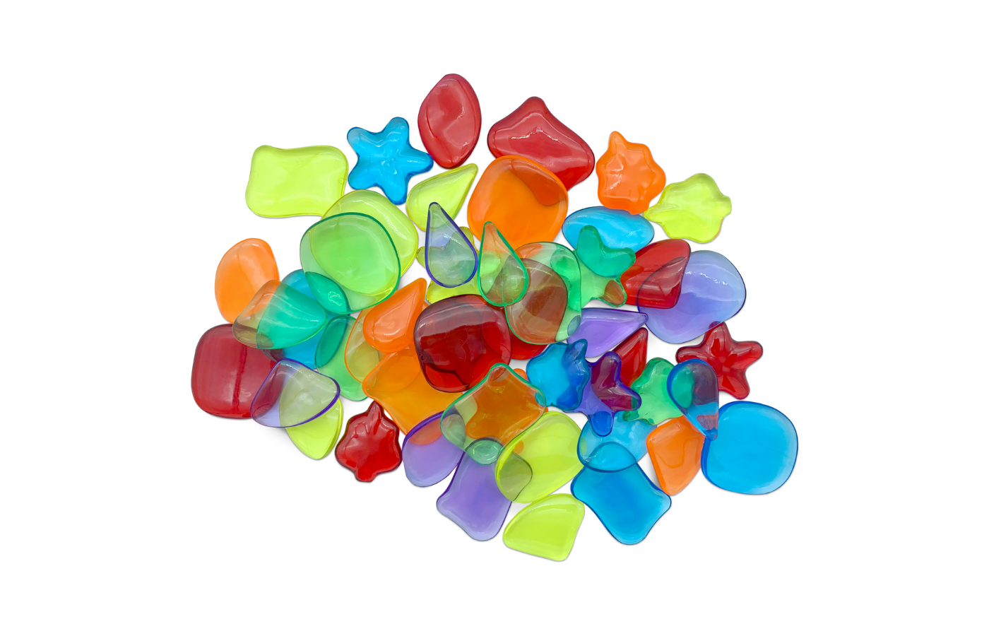 Deze set van transparante rotsen bestaat uit 8 verschillende, op natuur geïnspireerde vormen in 6 kleuren, geproduceerd in duurzaam, transparant plastic. Als extra bevat de set 36 opdrachtkaarten om patronen na te maken en stapeluitdagingen aan te gaan die variëren in moeilijkheidsgraad.