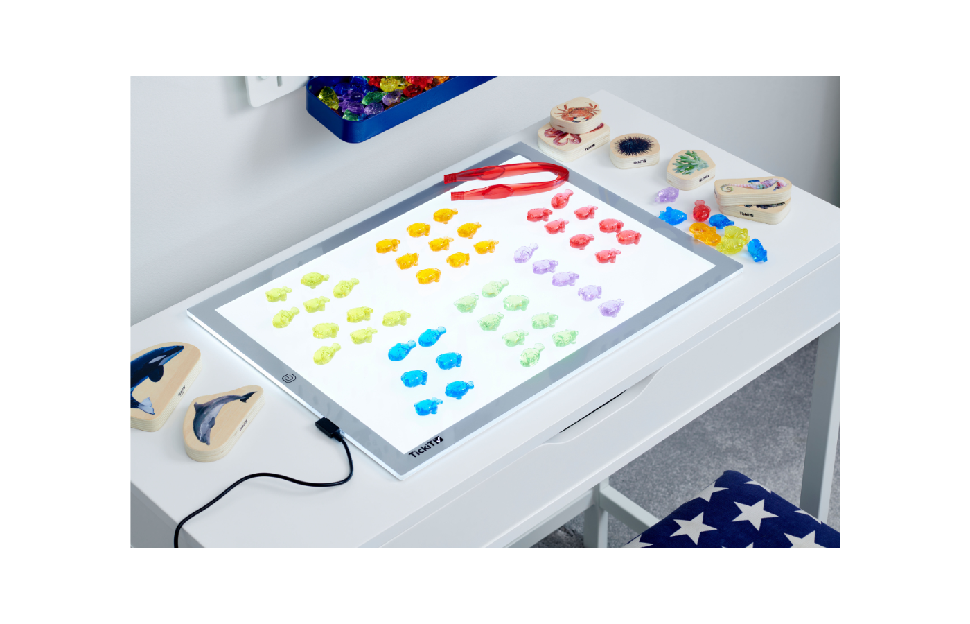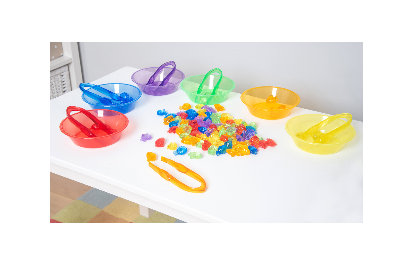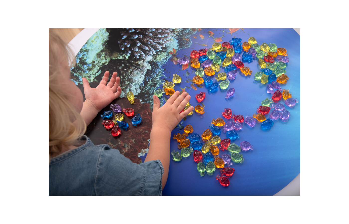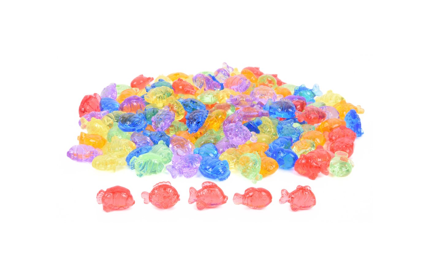 Deze set van 120 transparante vissen 6 verschillende kleuren en 5 verschillende soorten is ontzettend leuk om te gebruiken op de lichttafel of om te leren sorteren. Sorteren kan je doen op kleur, grootte of soort structuur. Op de lichttafel kan je ze over elkaar leggen om de kleuren te mengen.