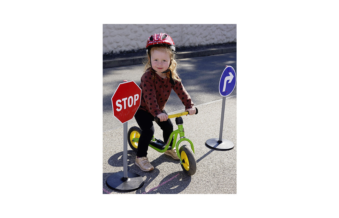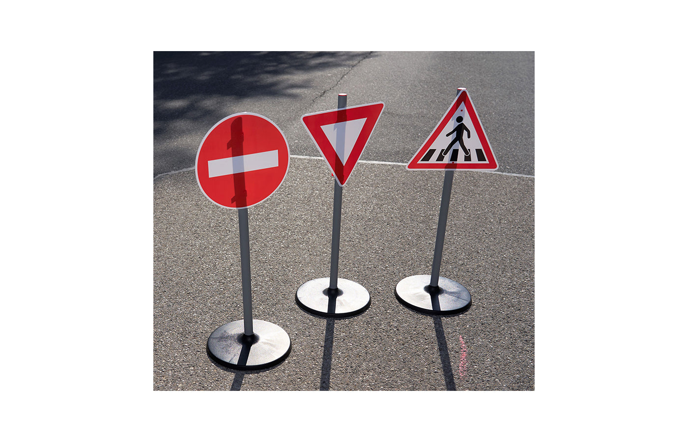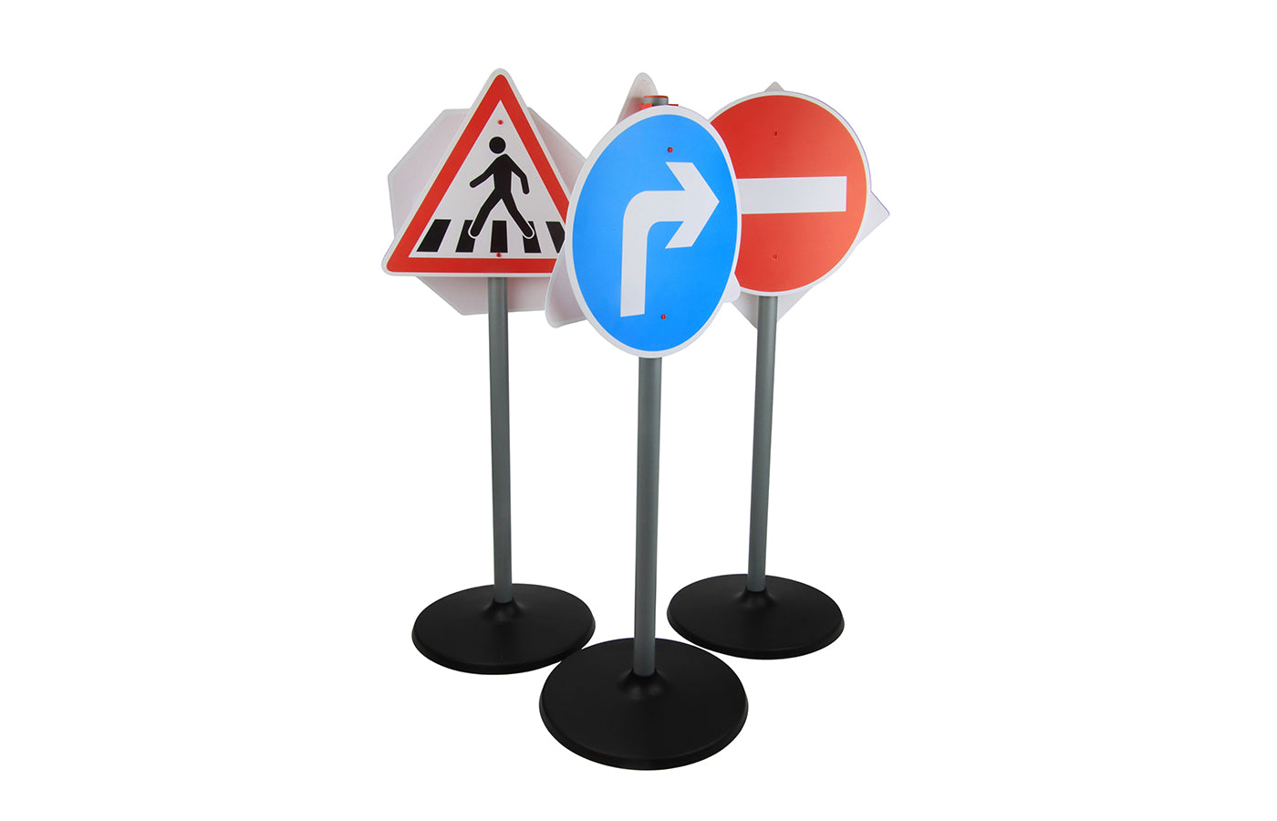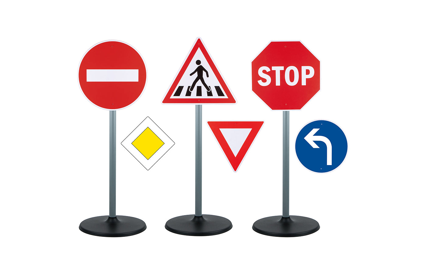 Met deze verkeersbordenset leren kinderen spelenderwijs de eerste verkeersborden en regels. De set bestaat uit 6 borden, 3 standaards en 12 clips om de borden aan de palen te bevestigen. Met de clips kunnen de verkeersborden aan één of beide zijden van de standaards worden bevestigd. Te combineren met het verkeerslicht en de kegels.