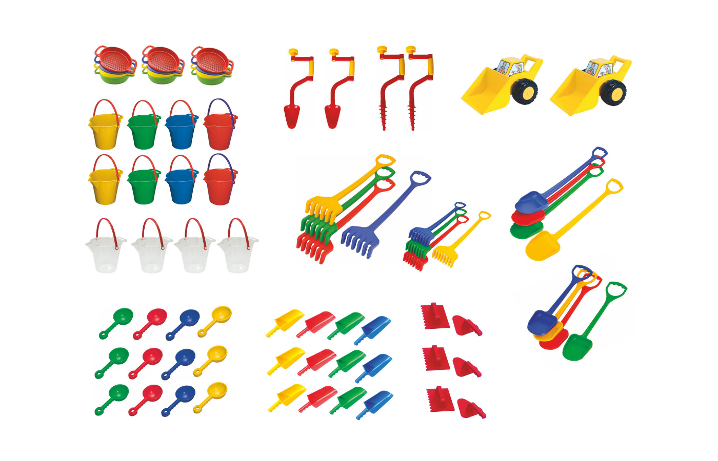 Met deze XL zandspeelset is het mogelijk om spannende avonturen te beleven. Complete set zandspeelgoed met verschillende onderdelen.